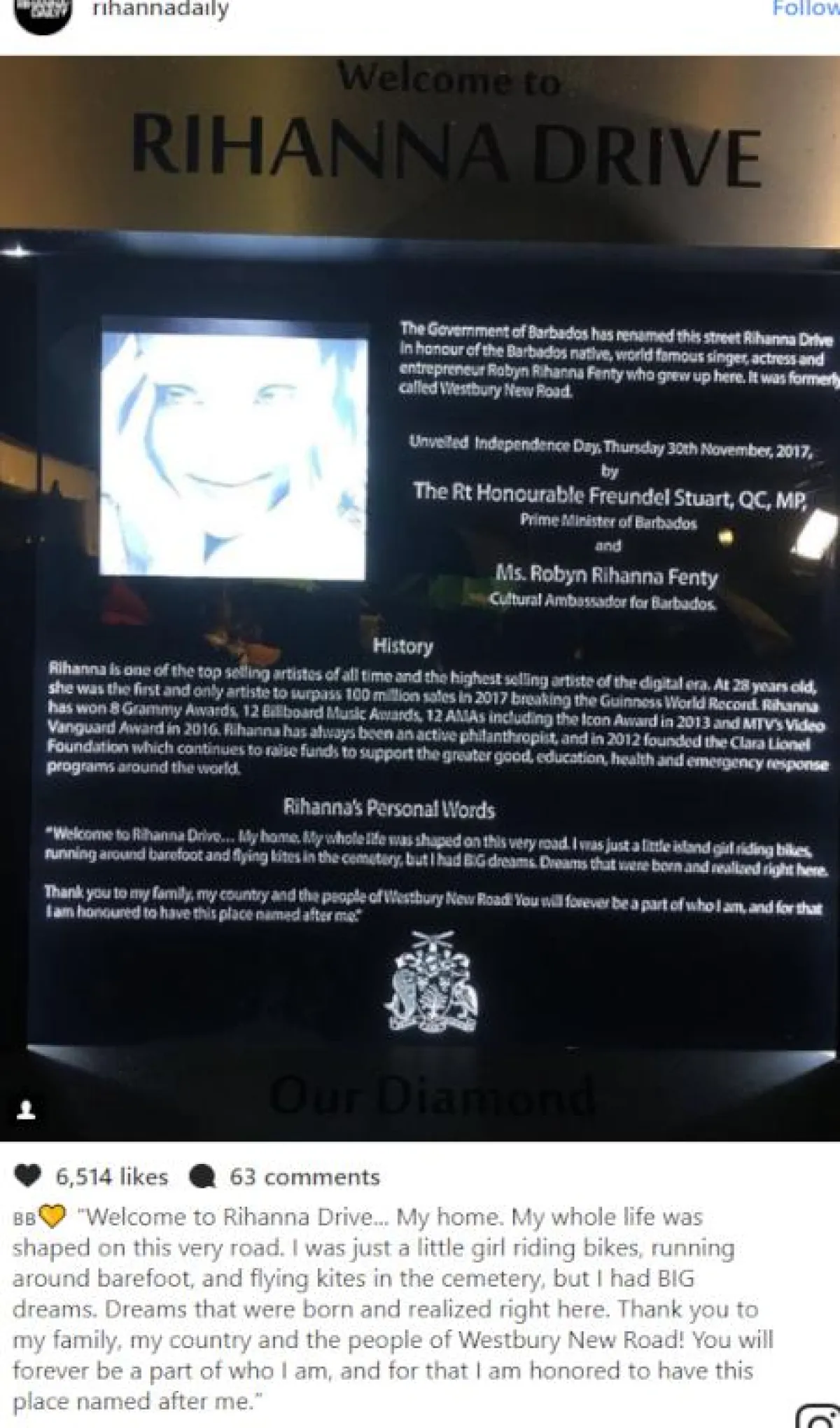 ونشرت ريهانا صورة احتفالاً بتغيير الاسم، وعلَّقت عليها قائلة: "مرحباً بكم في شارع ريهانا... منزلي. ملامح حياتي بأكملها تشكَّلت في هذا المكان. كنتُ مجرد فتاة صغيرة أركب الدراجات، وأركض حافيةً، وأُطيِّر طائراتٍ ورقية في المقابر، لكنَّ أحلامي كانت كبيرة. أحلامٌ وُلِدت وتحققت هنا. شكراً لعائلتي، وبلدي، وأهل طريق ويستبري الجديد! ستكونون دائماً جزءاً مني، وإنَّه لشرفٌ لي أن يحمل هذا المكان اسمي".