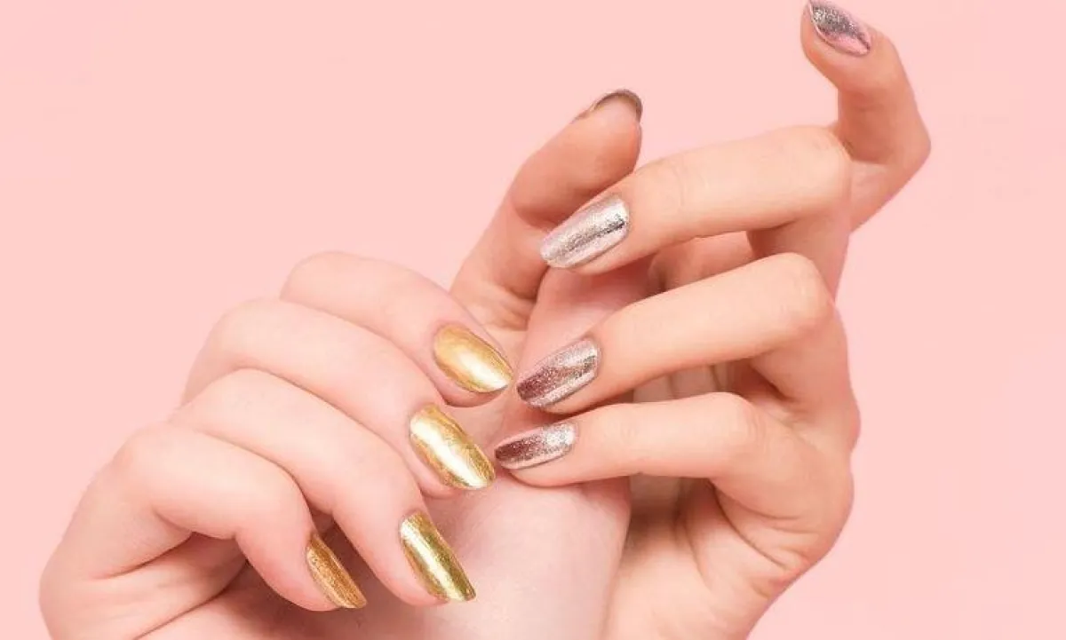 الأظافر الذهبية: تألّقي في المناسبات باطلالة ذهبية. أولًا طبّقي الطلاء الذهبي كأساس على أظافرك، ثم ضعي الرقائق الذهبية فوقها.