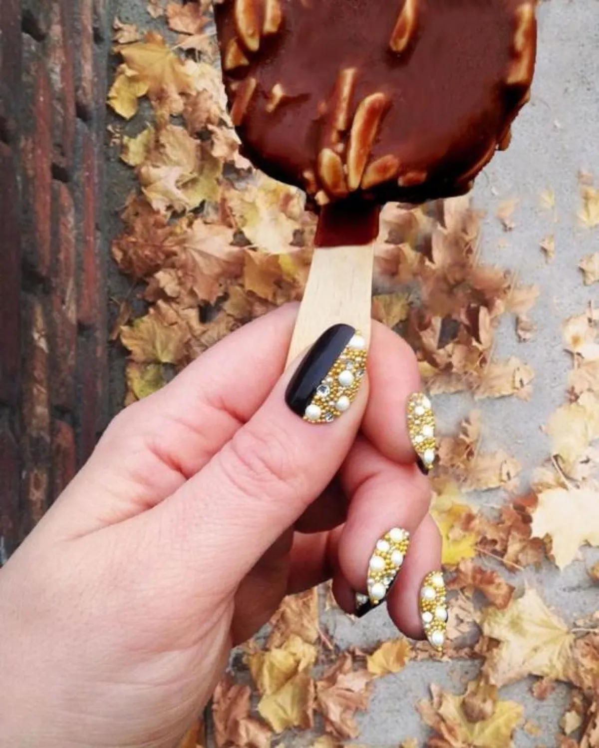 رسم النجوم: إطلي أظافركِ بقاعدة من لون الكراميل الجميل، ثم ضعي النجوم الذهبية الصغيرة بشكل متفرق على الأظافر لنهاية مشرقة.