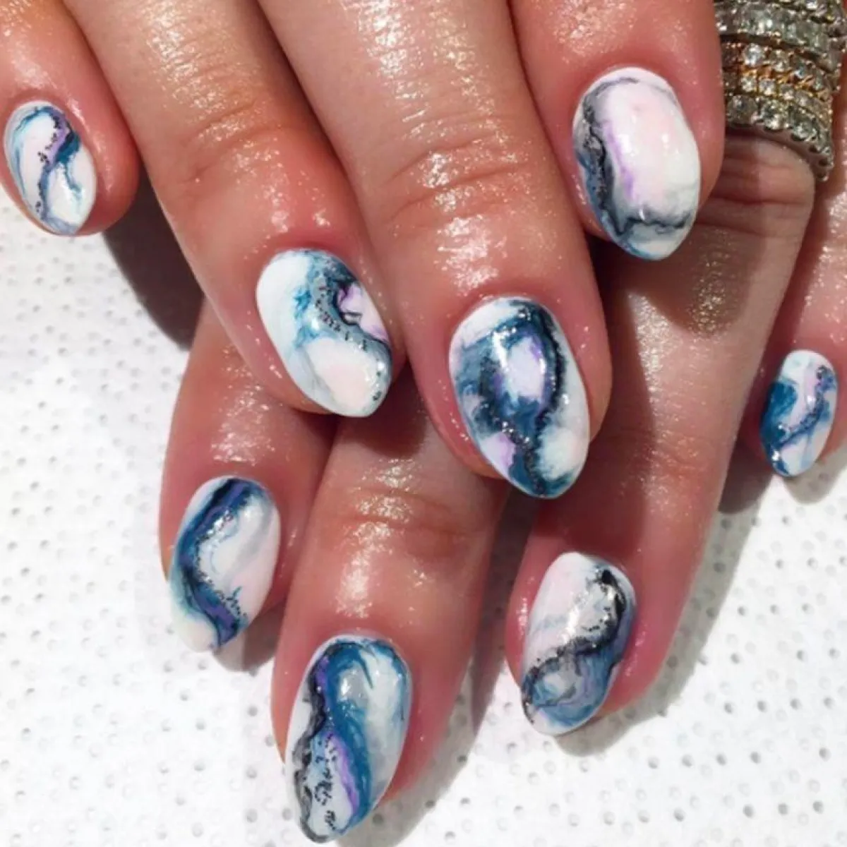الرخام : امزجي الألوان التالية على أظافركِ للحصول على نقشة الرخام الأبيض، مع الأسود، والأرجواني .