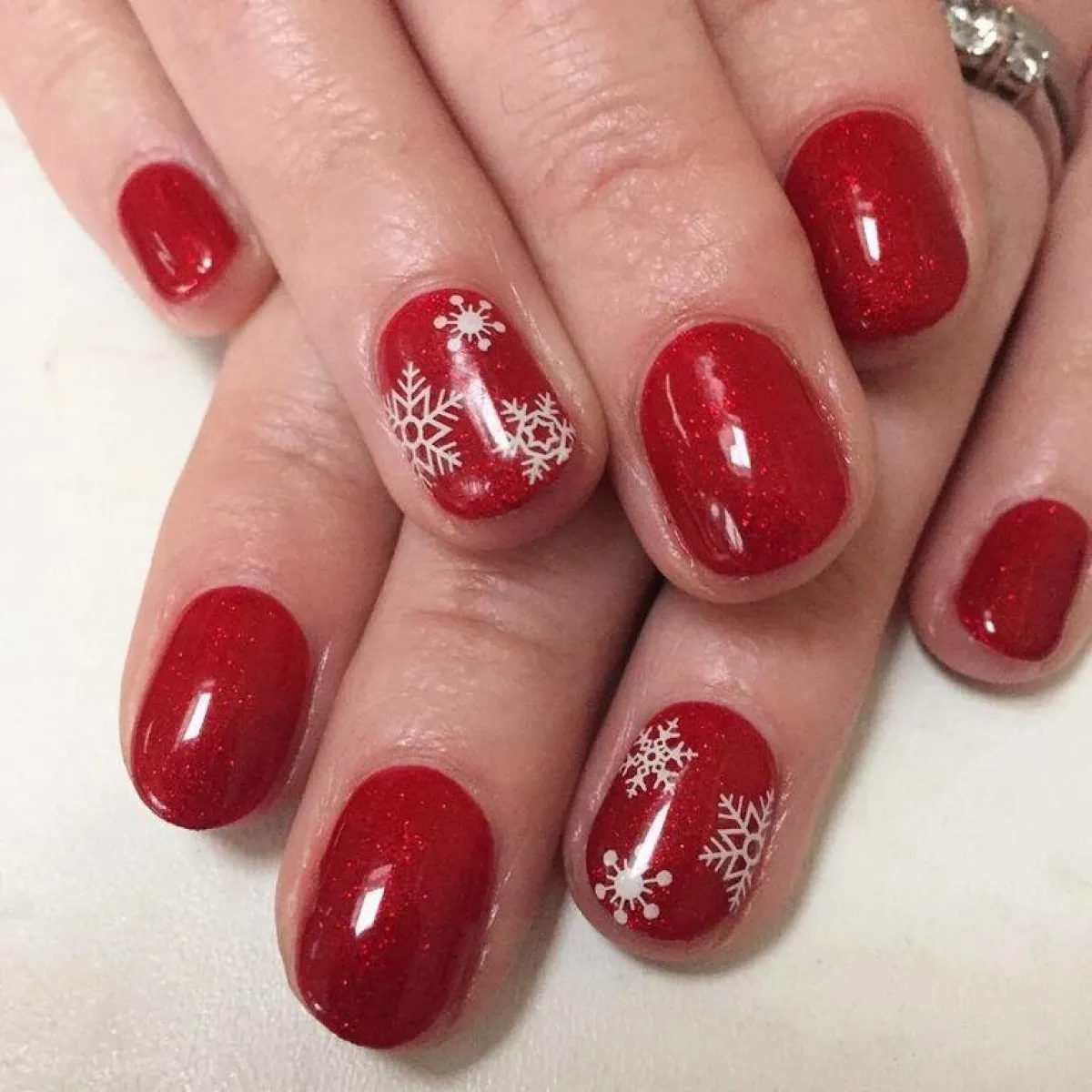 أشكال الثلج: أسّسي أظافركِ بالمناكير الأحمر، من ثم استخدمي ريشة رفيعة لرسم أشكال كريات الثلج على الأظافر.