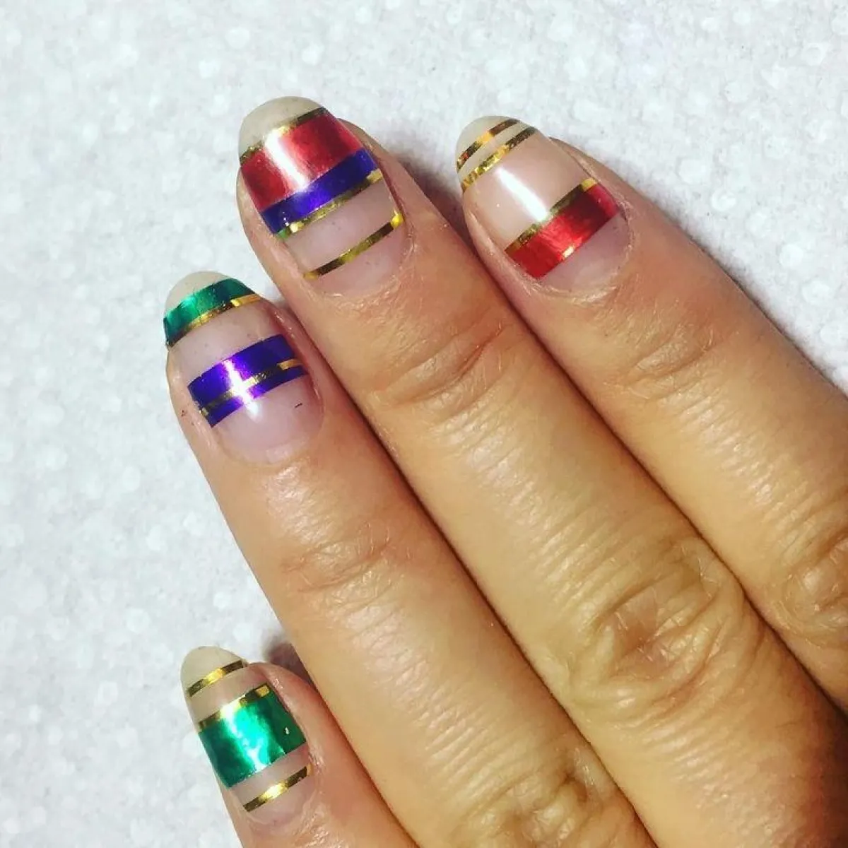 الشرائط المعدنية: اطلي أظافركِ بالمناكير الشفاف، من ثم طبّقي الشرائط المعدنية بالتناوب أفقيًّا. وأخيرًا ضعي طبقة من منشّف الطلاء.