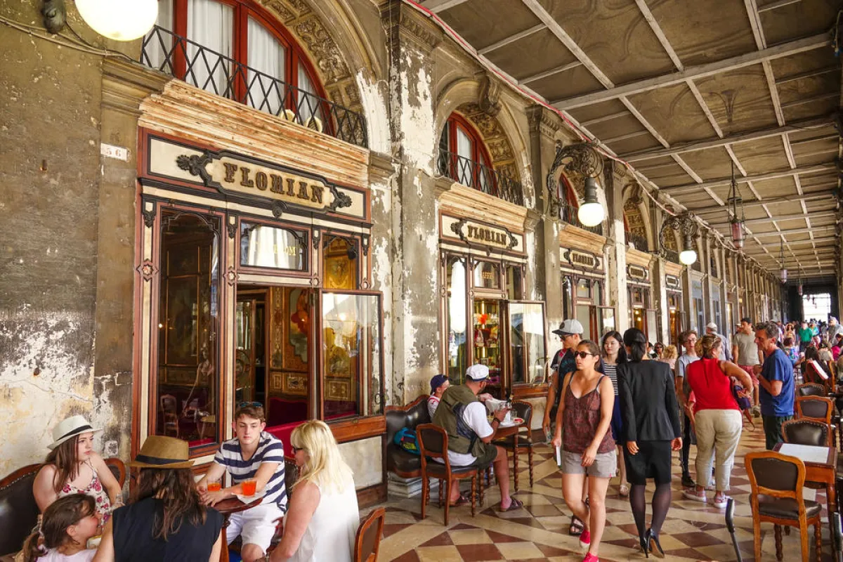 1. "كافيه فلوريان": في البندقيَّة، يعدُّ هذا المقهى الشهير الخيار الأنسب لعُشَّاق التاريخ والقهوة. يعود تاريخ تأسيسه إلى أوائل القرن الثامن عشر، ويمتاز بكونه واحدًا من المقاهي التي كانت سبَّاقة في استقبال الزبائن الإناث. مساحة مقهى "فلوريان" تنقسم إلى جزأين: الأوَّل عبارة عن متحف، والثاني مقهى يتمتَّع بـ"ديكورات" داخليَّة جذَّابة، ومن ملامحها الإنارة الخافتة والسقوف المُذهَّبة التي تضفي لمسات من الفخامة، التي يمكن مُلاحظتها فور الدخول من باب المقهى الرئيس.