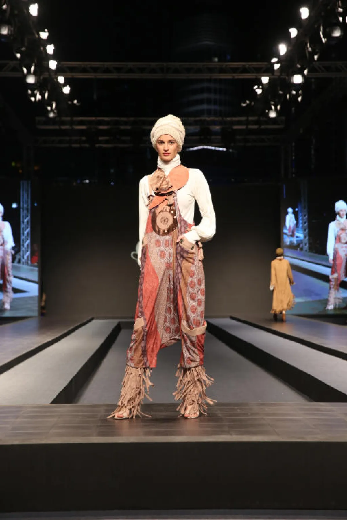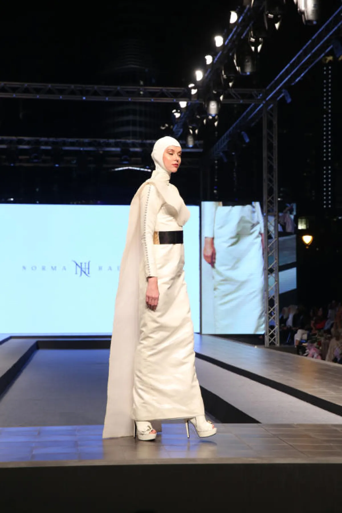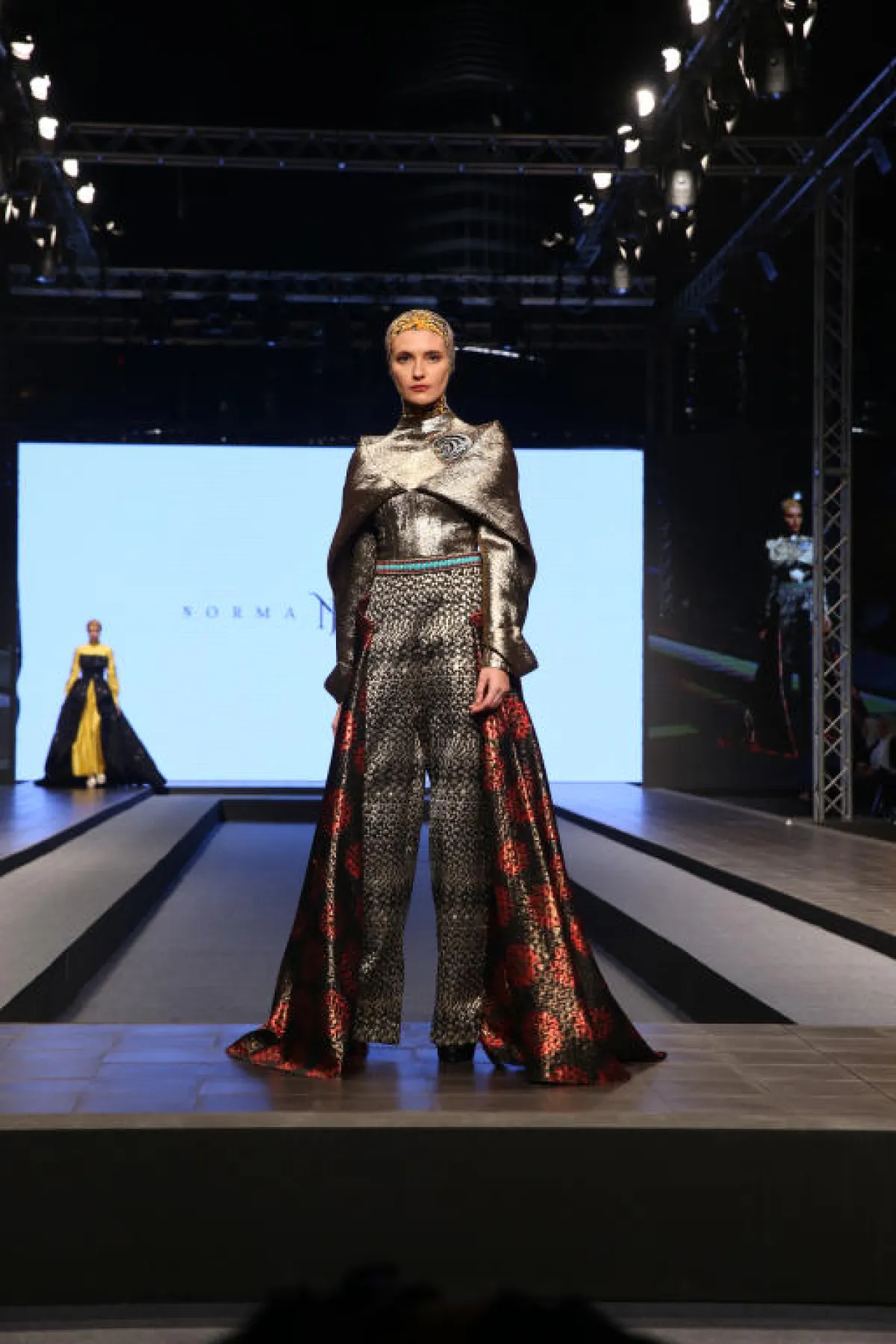 لفساتين المصممة Normah Hauri حكاية مختلفة اختصرت تفاصيلها بالزيّ الأول، تميز بلونه الذهبي اللامع، أكتافه البارزة، دمج اللون الأحمر في تنورته التي تعلو بنطال مزخرف، وتصميم غطاء الرأس المميز، بدت الفساتين وكأنها جاءت من الفضاء مع ألوانها المعدنية وأغطية الرأس المميزة.