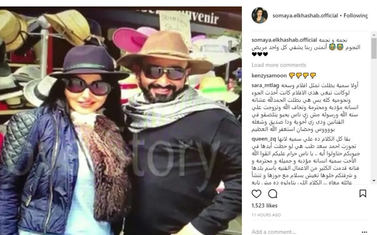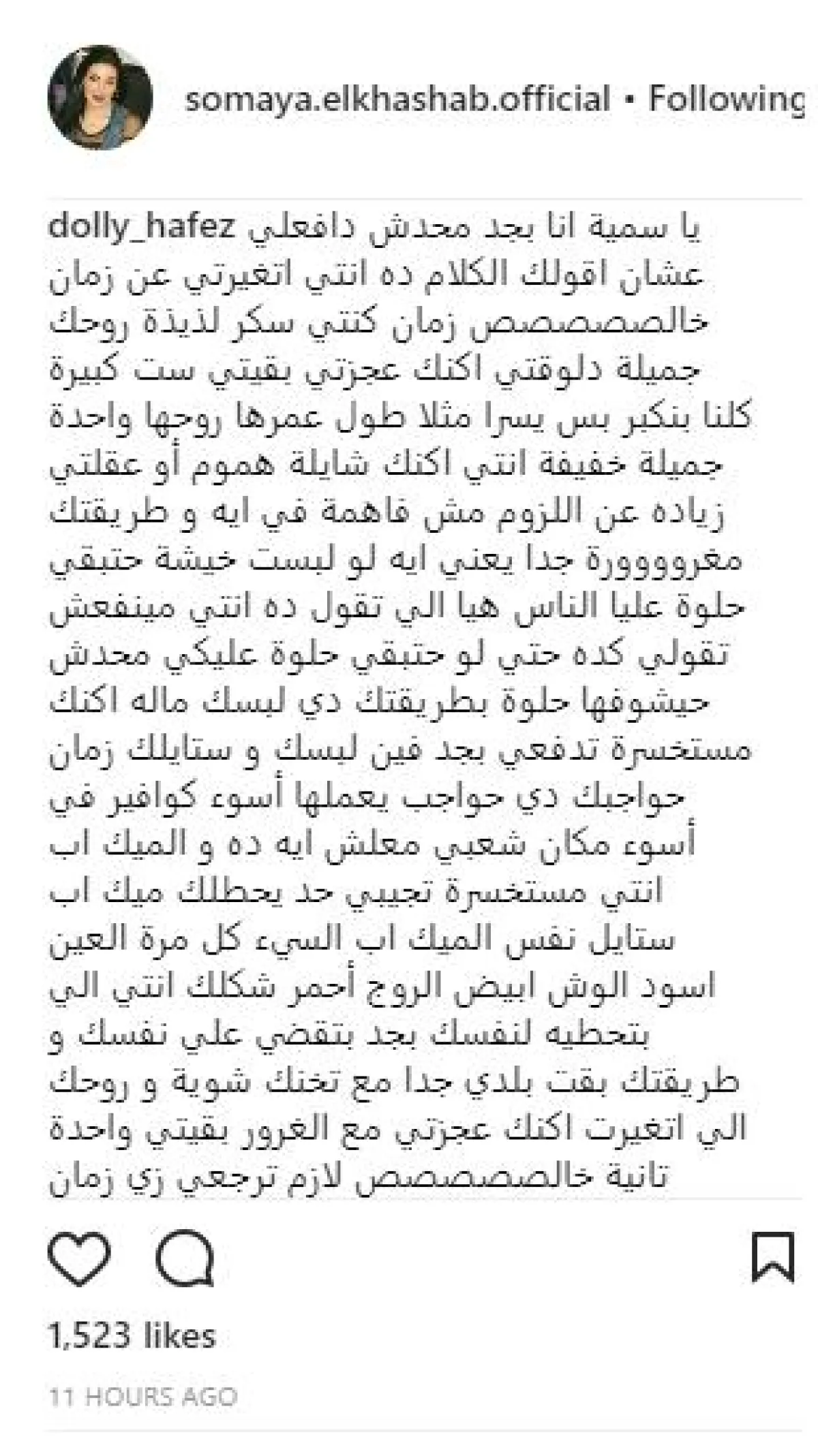 ريم البارودي قالت في لقاء لها عبر شاشة قناة "العربية"، خلال استضافتها ببرنامج "معكم"، إنّ سمية الخشاب ليست نجمة، وجاء الرد سريعًا من سمية بعدما نشرت صورة لها برفقة زوجها الحالي أحمد سعد، وعلقت عليها قائلة: نجمة ونجمة النجوم، أتمنى ربّنا يشفي كل واحد مريض، مع ثلاثة رموز للقلب باللون الأسود!!