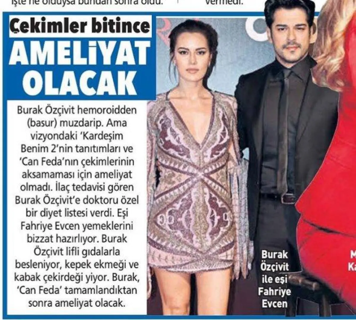 من جهة أخرى يستعد الممثل الوسيم بوراك أوزجيفيت لإجراء عملية بواسير عاجلة بعد زيادة آلامه بسببها، وكان عليه إجرائها حسب تعليمات طبيبه المعالج قبل أشهر لكن التزامه بتصوير فيلمه "أخي2" مع مراد بوز وبعده فيلمه الجديد "فداء الروح" مع كرم بورسين جعله يؤجل العملية لفترة طويلة لم تكن لصالحه رغم خضوعه للعلاج الدوائي.