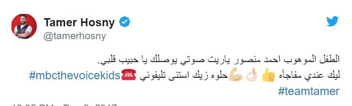 تدارك المطرب تامر حسني خطأ التفريط في الموهبة المصرية الصغيرة أحمد منصور، الذي خرج خالي الوفاض من تصفيات الحلقة الثانية من برنامج "ذا فويس كيدز"، بعدما فشل في إقناع ثلاثي لجنة التحكيم نانسي وكاظم وتامر في الاستدارة إليه، ونشر تامر تغريدة عبر حسابه في تويتر مؤكدًا أنه بصدد تجهيز مفاجأة لمنصور.