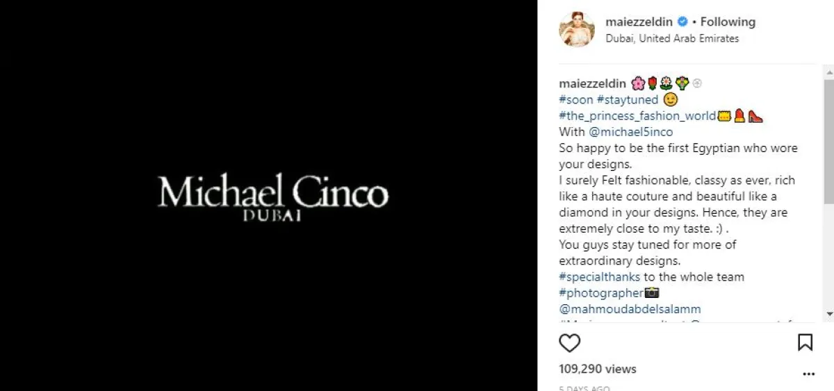 أضافت عبر صفحتها الشخصية على موقع انستقرام: سعيدة إني أول مصرية تلبس من أزيائك خصوصًا أنها تصاميم قريبة لذوقي الشخصي، اوعدكم هتشوفو فعلًا تصاميم غنية وراقية.