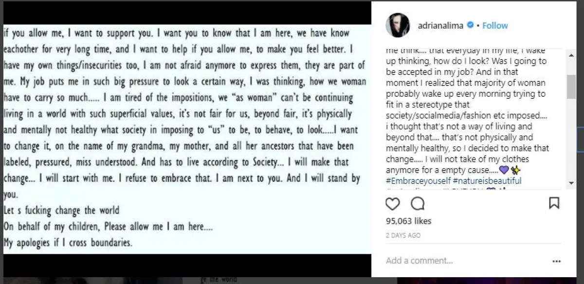 وأرفقت أدريانا الصورة أيضًا بتعليق كتبت فيه: "تلقيت عرضًا لتصوير فيديو مغرٍ لي لنشره على وسائل التواصل الاجتماعي، ورغم أنني صورت هكذا أمور في السابق، إلا أنّ شيئًا ما تغيّر هذه المرة، فبعد أن أخبرتني صديقتي بأنها غير راضية عن شكل جسدها، بدأت أدرك أنني في كل يوم في حياتي أستيقظ وأنا أتساءل كيف أبدو اليوم. هل سأُقبل في عملي؟ وفي تلك اللحظة، تيّقنت بأنّ أغلب السيدات على الأرجح يستيقظنَ كل صباح، ويحاولن أن ينتمين إلى فئة معينة، اجتماعيًّا أو موضويًّا، أو في عالم التواصل الاجتماعي...وهذا أمر غير صحي لا على الصعيد النفسي ولا الجسدي".