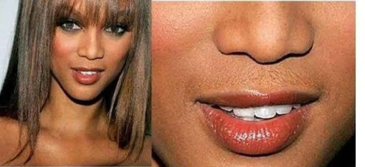 أما النجمة تايرا بانكس Tyra Banks فبدا الشعر الزائد في وجهها فوق شفتيها، وهذا ما ظهر عند النجمة الشابة مايلي سايرس Miley Cyrus تحديدًا عند منطقة الذقن.