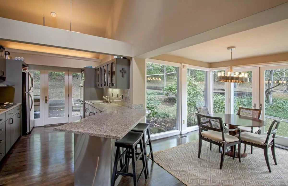 كان المالكان يتناولان وجباتهما، وهما يستمتعان بخضرة الحديقة الخارجيَّة، حيث تتمركز طاولة الطعام الدائريَّة المشغولة بالخشب، بجوار النوافذ المُمتدَّة من الأرض إلى السقف. وهناك، ثمة ثريَّا تتخذ شكل حامل الشموع، ما يضفي لمسات دافئة في المساحة. وعلى خلاف الديكور الهادئ السائد في معظم الغرف، تتلوَّن جدران غرفة النوم الرئيسة بالأخضر الـ"باستيل"، فيما واجهاتها مؤثَّثة بنوافذ تكشف الطبيعة الجذَّابة للجالس على السرير الخشب المُزوَّد بأربعة أعمدة. أمَّا الحمَّام الرئيس المطلي بالأبيض فيضمُّ حوضين للغسل، يفصل بينهما حوض الاستحمام المدمج. ولأعمال الرخام جاذبيَّة في الحيِّز.