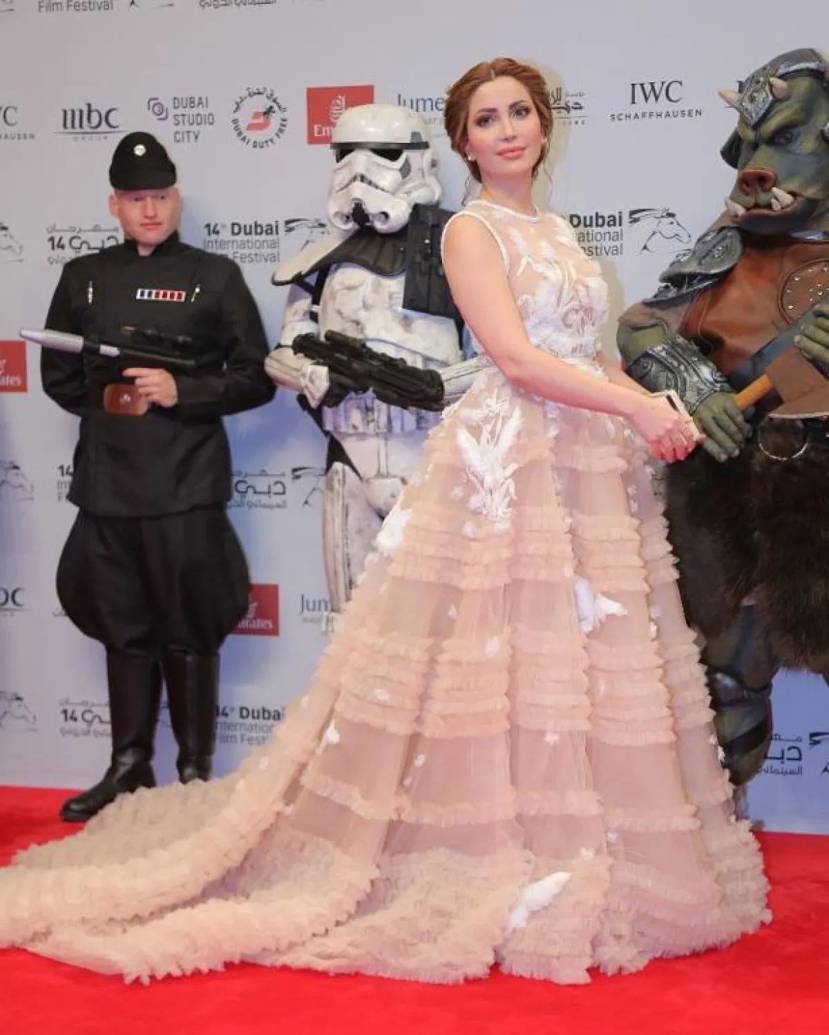 دخلت الفنانة نسرين طافش المنافسة مع نجمات عالميات مثل جينفر لوبيزو بيونسية و كيتي بيري، ومحلياً مع الفنانة أصالة نصري، حيث إنها ارتدت في حفل ختام مهرجان دبي السينمائي فستاناً من مجموعة المصمم العالمي amato، ومن المعروف عنه أنه لايتعامل إلا مع النجمات العالميات، وعربياً لم يتعامل إلا مع الفنانة أصالة نصري، وهو يرفض أن يقدم لأي فنان عربي، كما صرح بأحد اللقاءات، بأنه يفضل التعامل مع نجمات أجنبيات؛ لأنهم يخدمون تصاميمه بشكل أكبر، وتألقت طافش بحفل الختام بفستان يحمل اسم البجعة البيضاء المعروفة بجمالها عالمياً، وكان الفستان مشغولاً يدوياً، أما الماكياج والشعر فكان من لمسات مستشارة التجميل روز عربجي، التي اختارت لها الإطلالة وصممتها لها بشكل كامل.