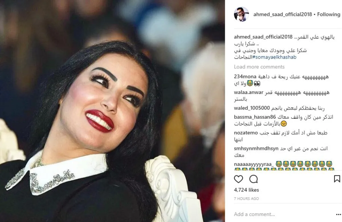 أحمد سعد نشر للمرة الأولى صورة منفردة لزوجته سمية الخشاب عبر انستقرام، وأعاد مشاركتها عبر حسابه بموقع الفيس بوك، وعلق عليها بقوله: يا لهوي على القمر، شكرا يا رب، شكرا على وجودك معايا وجنبي كتف في كتف في النجاحات "