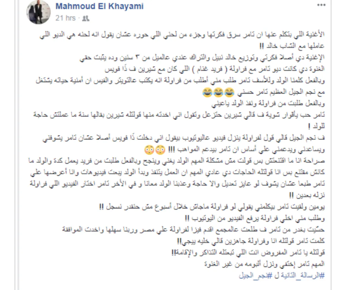 يبدو أن المطرب تامر حسني على موعد مع "ورطة كبرى" بعدما تسبب الخلاف بينه وبين الملحن محمود الخيامي في كشف الأخير كواليس سرقة تامر لحن الديو مع النجم الجزائري الشاب خالد، والأخطر هو كشف تعمد تامر إهانة نجم برنامج ذا فويس فريد غنام الشهير بفراولة.