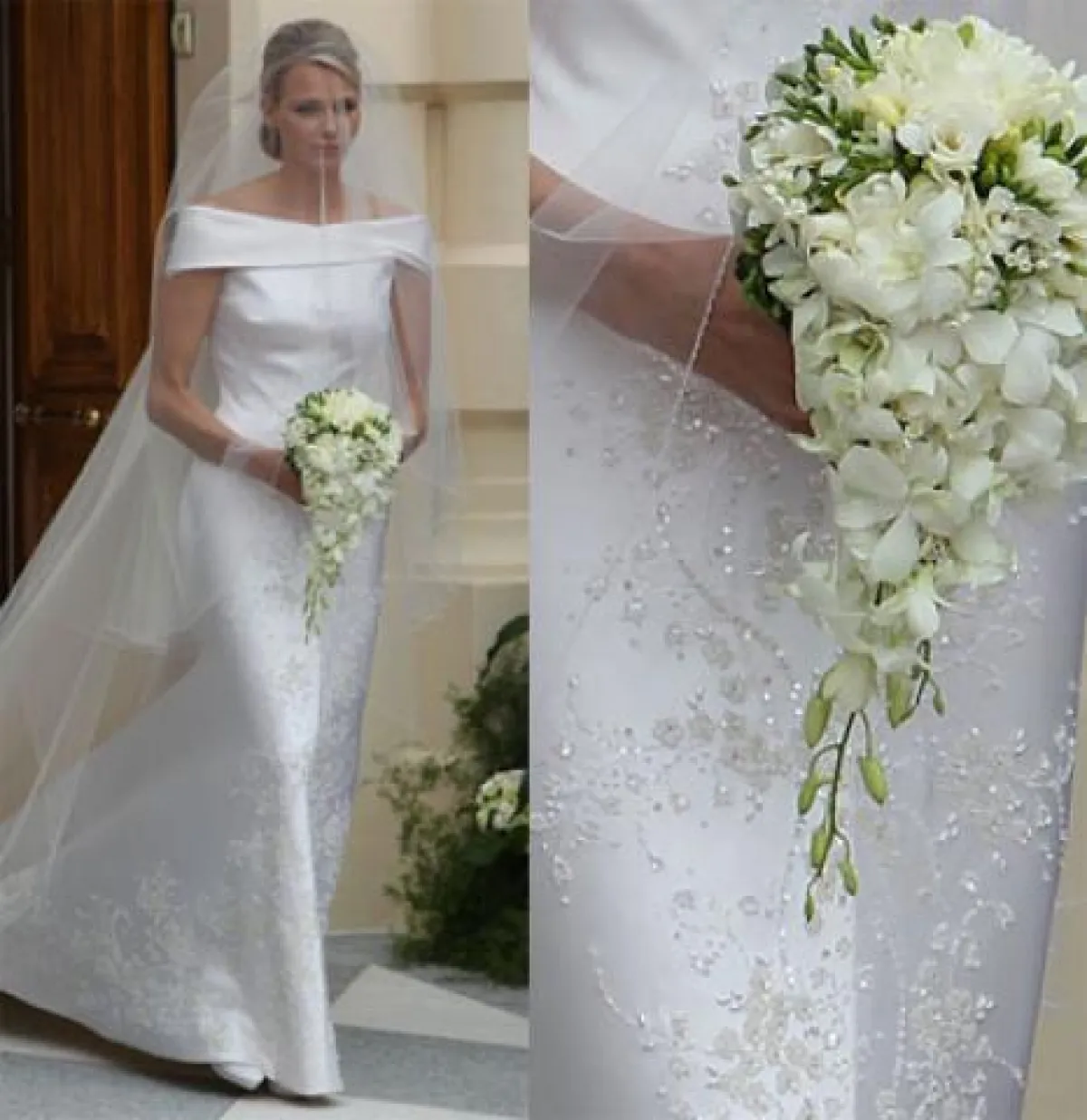 من جهتها اختارت الأميرة "شارلين" دو موناكو اللمسة العصرية، التي وضعها على فستان زفافها المصمم الإيطالي جورجيو أرماني، Georgio Armani، جاء فستان الزفاف بسيطًا في قصاته، وغنيًّا بالتطريزات الفاخرة التي بدأت من أعلى الفستان وحتى حوافه ، طُرّز بـ 40,000 حبة من أحجار سواروفسكي، و 20,000حبة لؤلؤ، و30,000حبة من الأحجار المذهّبة، نسقته بطرحة طويلة طُرّزت بصفوف من أحجار اللؤلؤ .