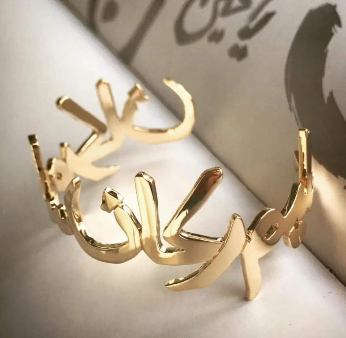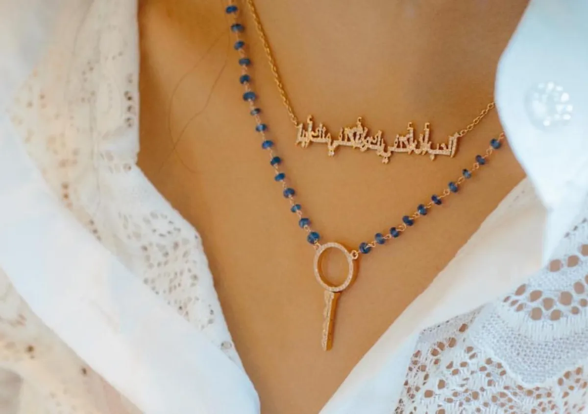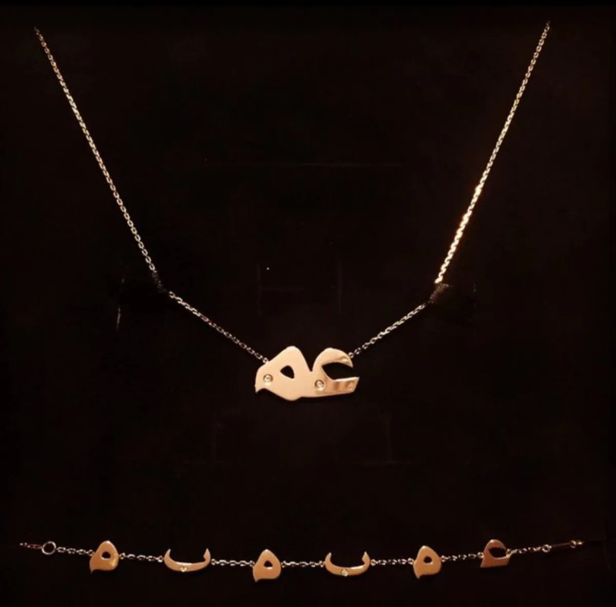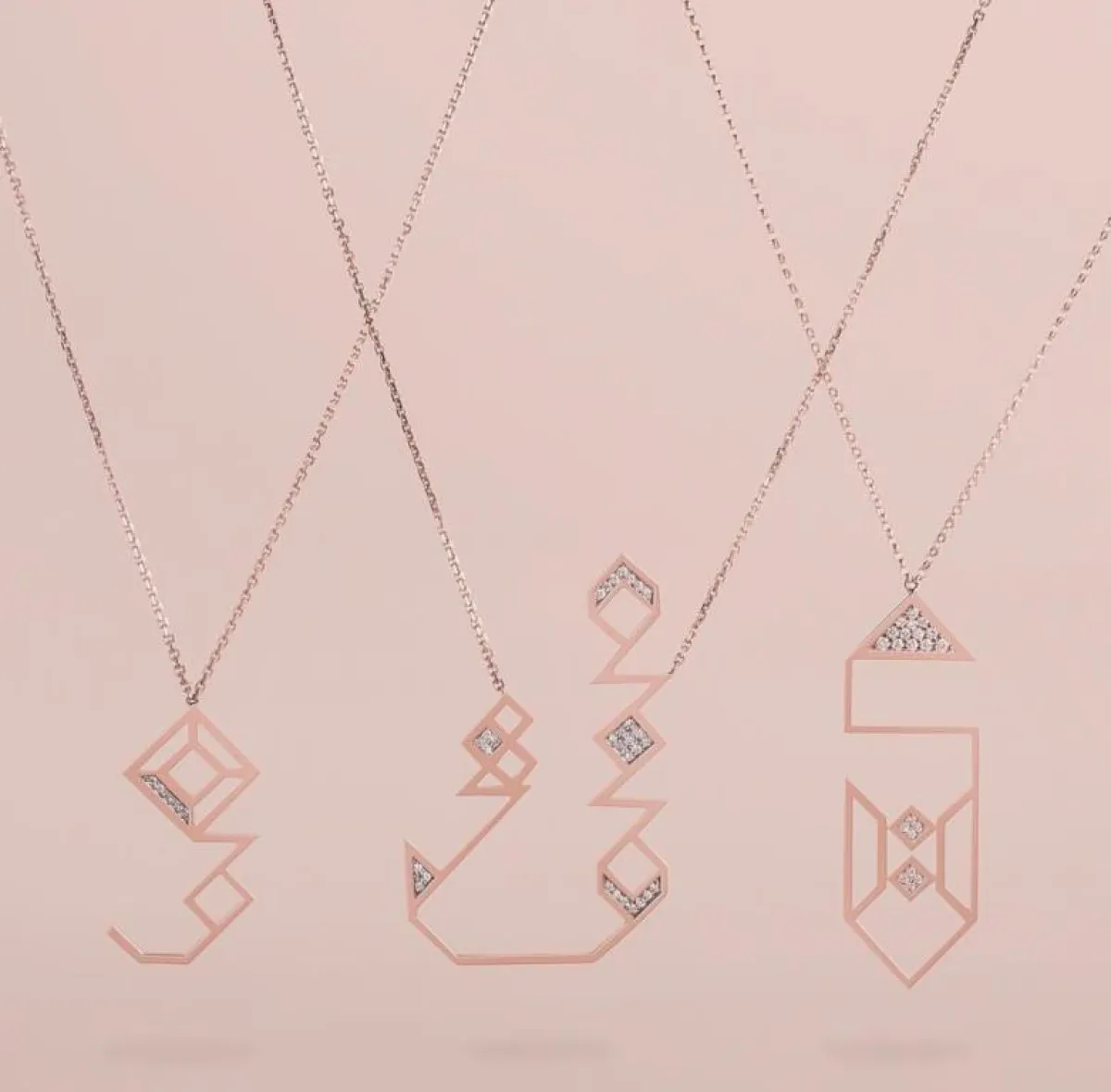 الكثير من التصاميم التي تنوّعة بين العقود والخواتم والأساور، اتخذت أشكال الحروف العربية فجاءت شبابية وعصرية وفي الوقت نفسه عميق بمعناها. ولعلّ مصمّمة المجوهرات اللبنانية ندين قانصو كانت أول من أطلق هذه الصيحة ولكنها بالتأكيد لم تكن الوحيدة.