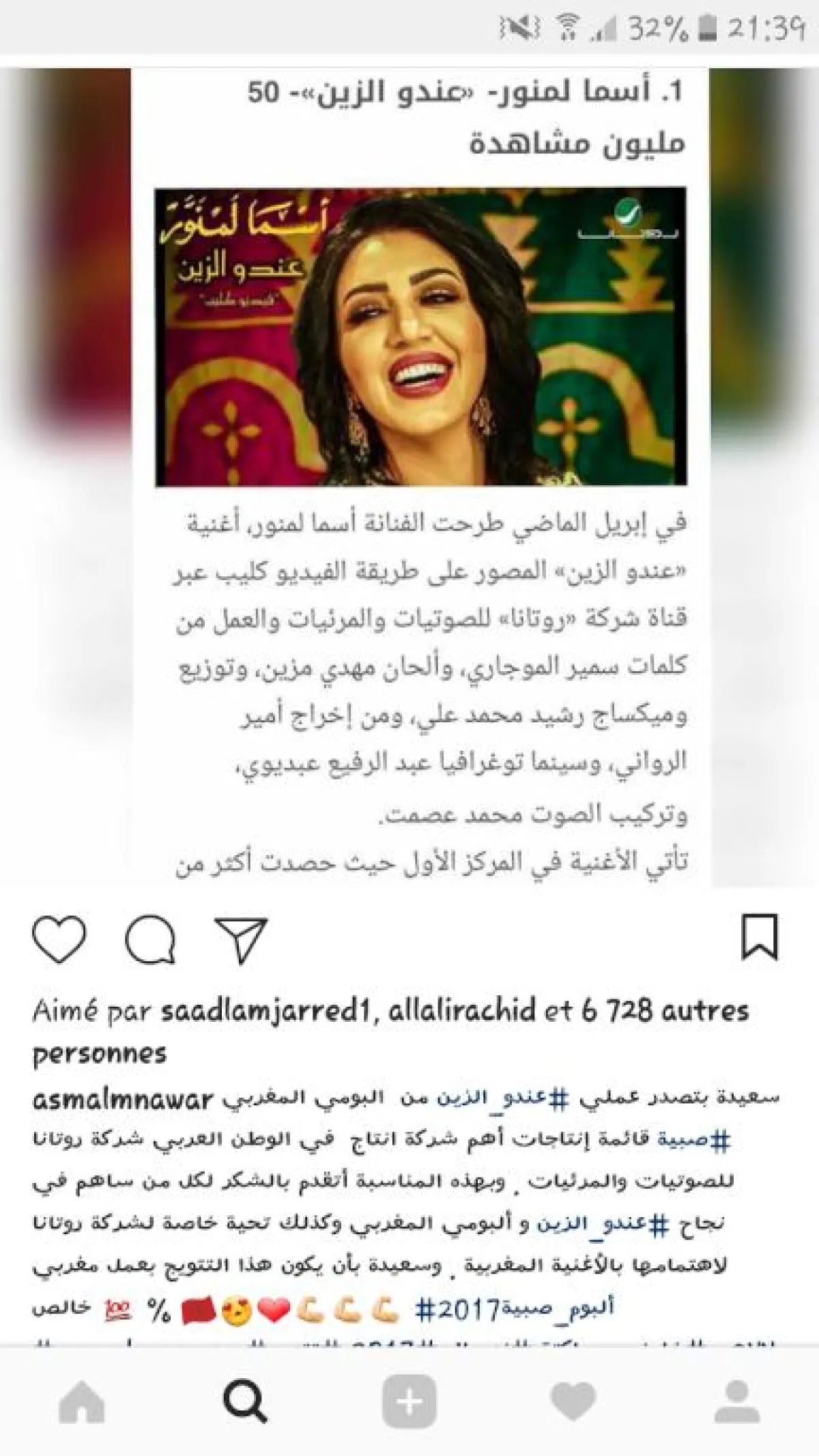 وقالت المنور في تدوينة لها عبر حسابها الرسمي على موقع الصور "إنستقرام": "سعيدة بتصدر عملي عندو الزين من ألبومي المغربي "صبية" قائمة إنتاجات أهم شركة إنتاج في الوطن العربي، شركة روتانا للصوتيات والمرئيات".