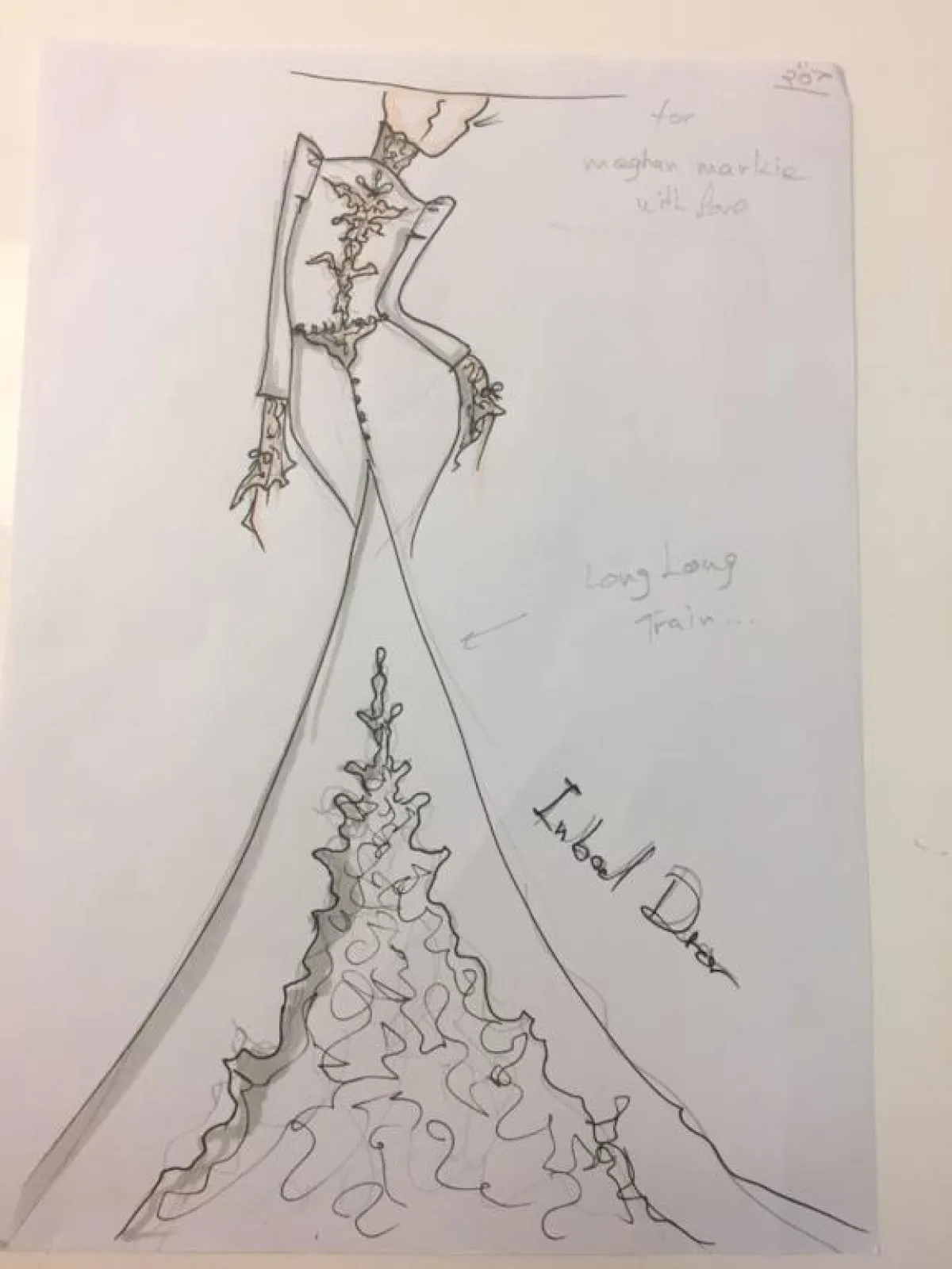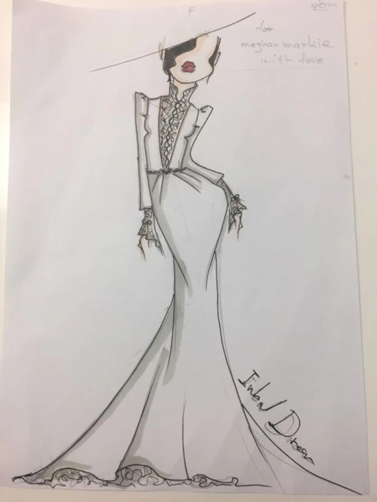 وما إن أعلنت اختيارها للمصمم حتى تسربت بعض الرسوم التي تحمل توقيع المصمم، وقيل إنها أُرسلت للعروس لاختيار فستانها، ومن بينها تصميم غريب أثار الكثير من التساؤلات لفستان ضيّق ذي أكمام طويلة، بالإضافة إلى الذيل الطويل.