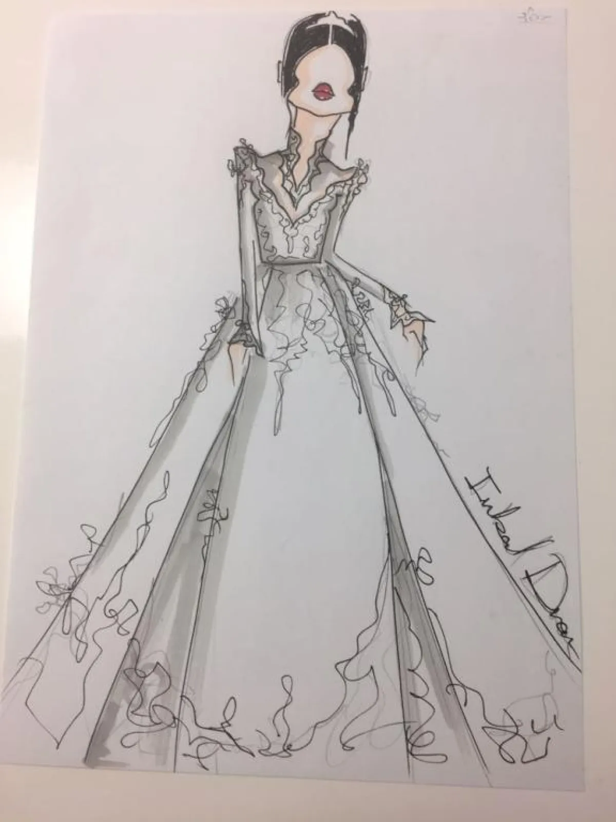 وما إن أعلنت اختيارها للمصمم حتى تسربت بعض الرسوم التي تحمل توقيع المصمم، وقيل إنها أُرسلت للعروس لاختيار فستانها، ومن بينها تصميم غريب أثار الكثير من التساؤلات لفستان ضيّق ذي أكمام طويلة، بالإضافة إلى الذيل الطويل.