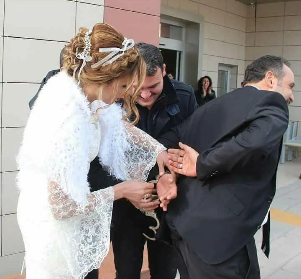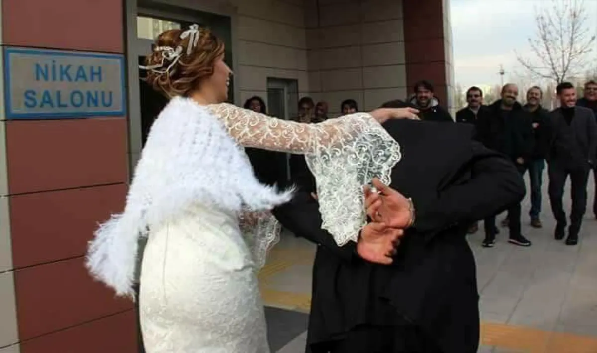 وهذا تماماً ما حدث مع عروس تركية تعمل شرطية في المركز الأمني في ولاية "قونية" وسط تركيا، حيث قامت بإحضار عريسها مكبلاً بـ"الكلبشات" إلى صالة العرس، وقامت باقتياده إلى الداخل كأنه واحد من المجرمين الذين تقبض عليهم في كل يوم، بين ضحكات واحتفالات الأهل والأصدقاء، وكل ذلك وهي ترتدي فستان زفافها، وتتزين بكامل زينتها، لتجمع أنوثة وجمال العروس، مع جدية وقوة وظيفتها كشرطية بصورة غريبة وطريفة، وبالوقت نفسه كان عريسها، خاضعاً تماماً لهذا الدخول الغير مألوف لأي عريس يوم زفافه، ومُسلماً هذا المسكين إلى قدره الجديد مع امرأة القانون التي سيقضي معها بقية عمره، مُسلماً نفسه لها بابتسامة عريضة، لا تخلو من الحب.