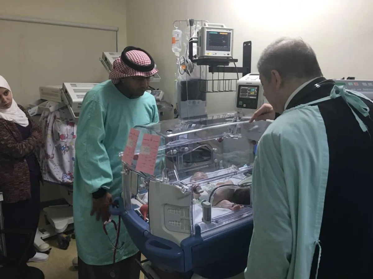 وعليه قام نائب رئيس البعثة الأستاذ محمد العتيق ورئيس قسم الشؤون الصحية ماجد الخيبري إلى جانب عدد من موظفي السفارة السعودية في الأردن، باستقبال التوأم السيامي ووالدهم فور وصولهم إلى الأردن عبر معبر "أريز"، حيث تم نقل التوأم إلى مستشفى المركز العربي الطبي في العاصمة الأردنية عمان، للاطمئنان على حالتهم الصحية، وتم وضعهم في قسم "الخداج" نتيجة لأصابتهم بحالة إعياء شديد.
