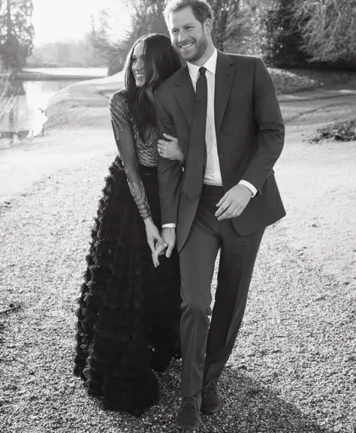 وظهر الثنائي وهما جالسان على درج قصر ويندسور يمسكان بيديّ بعضهما، فيما أظهرت صورة أخرى باللونين الأبيض والأسود ميغان في حضن الأمير هاري، وخاتم الخطوبة في يدها.