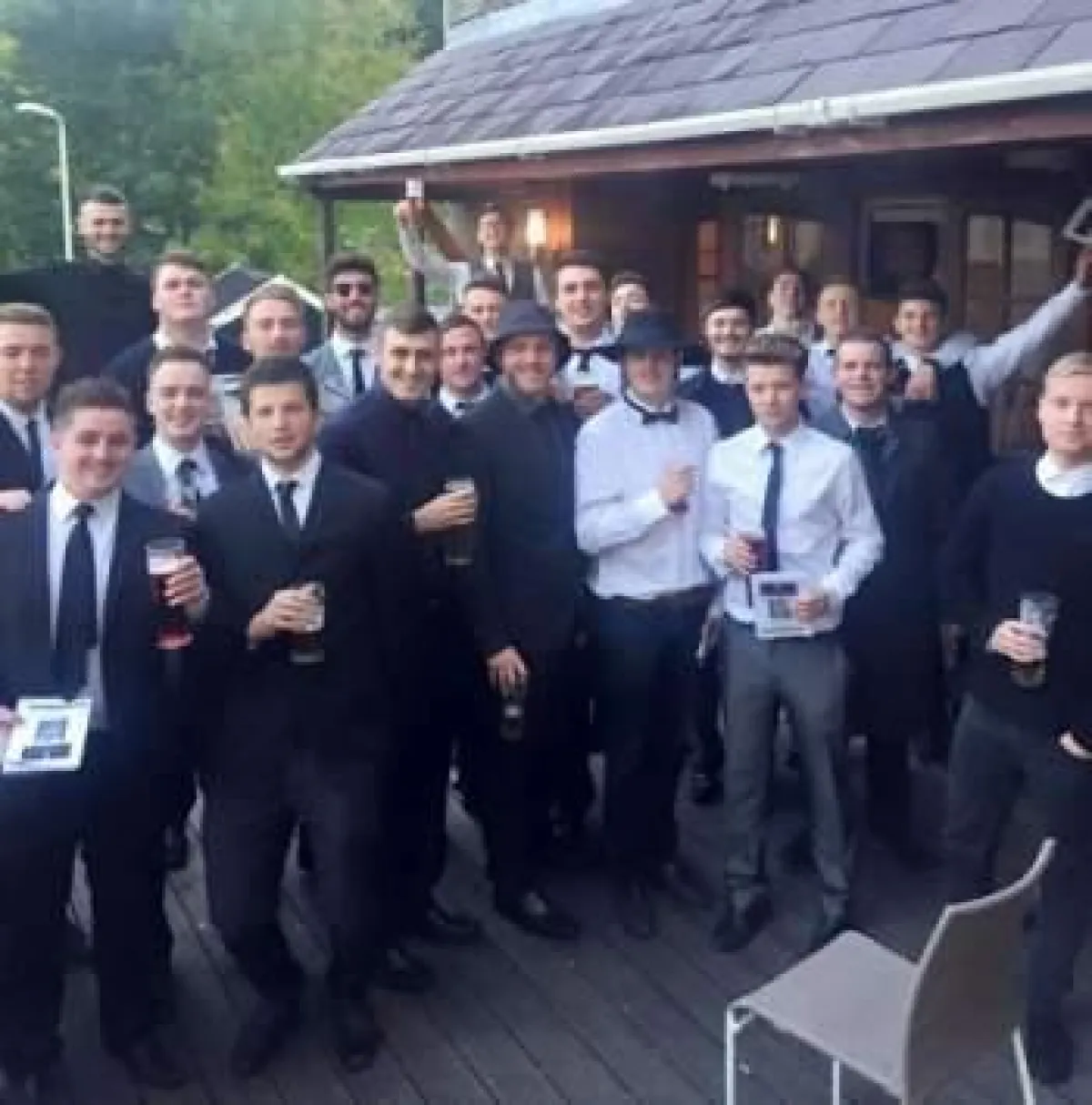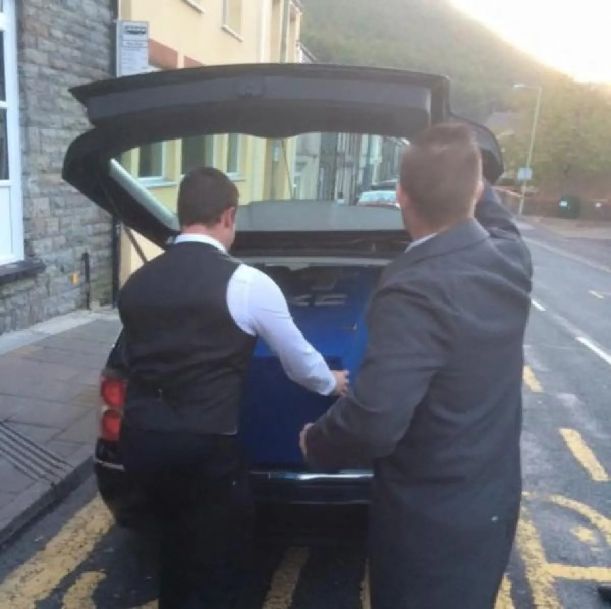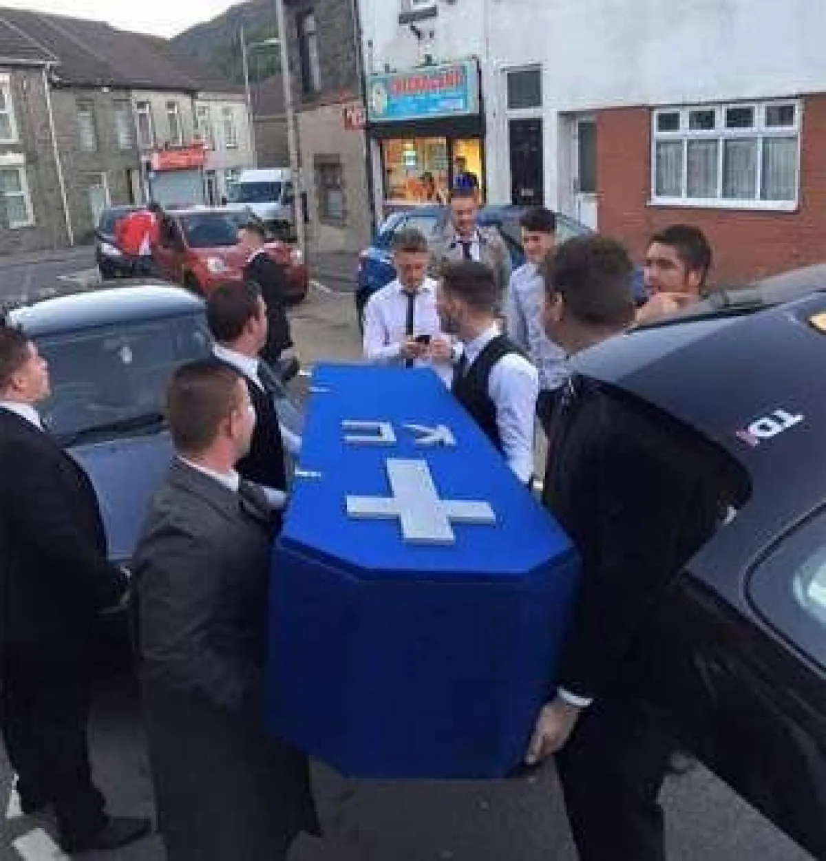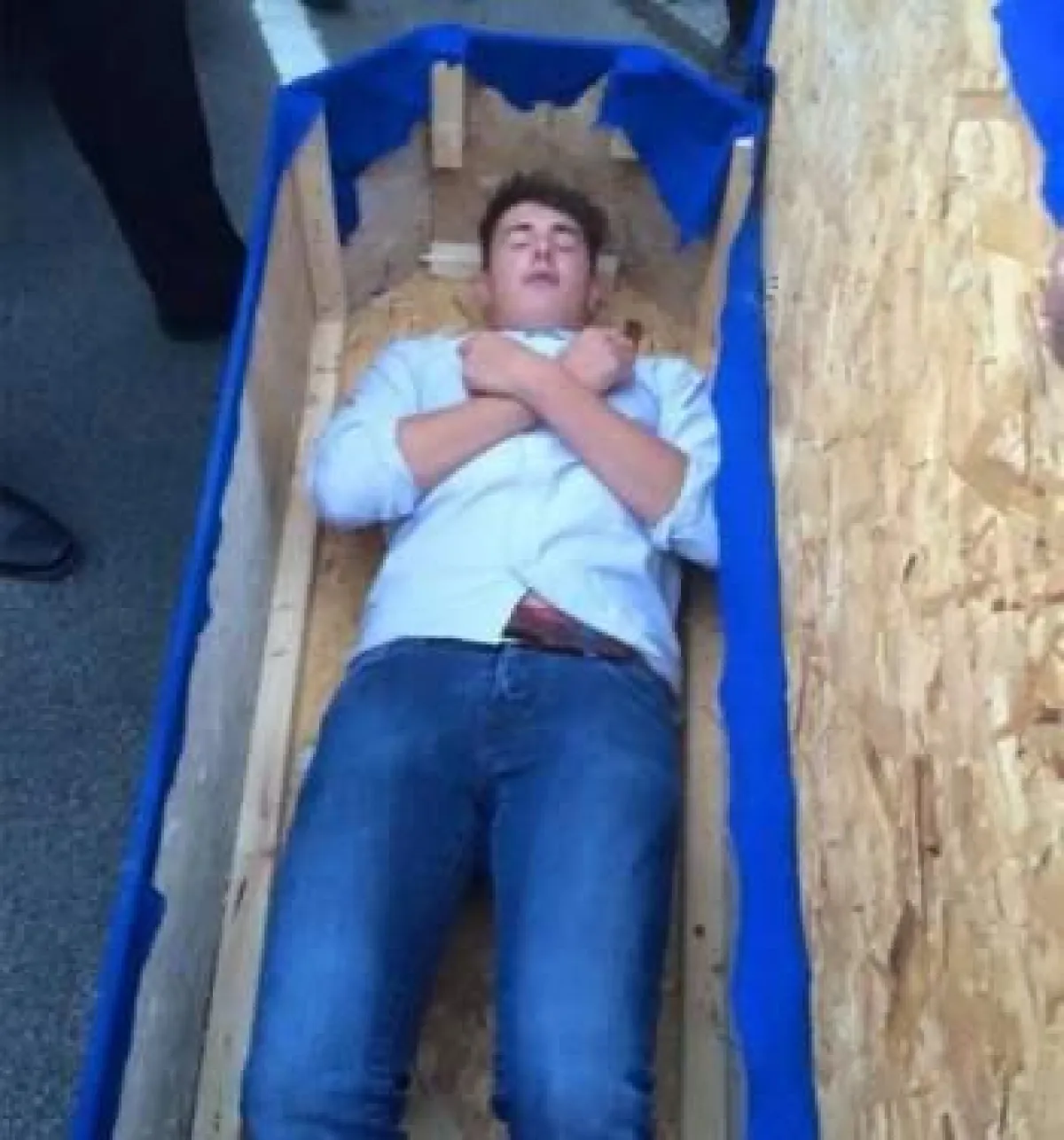 الشاب "كايبل" الذي لم يكن على علم بهذه الترتيبات كلها، وكان يظن أنه سوف يذهب لمشاهدة مباراة في رياضة الـ"رغبي"، انتهى الأمر به في نعش مزيف، استعاره أحد أصدقائه مع سيارة لنقل الموتى، وصاروا ينقلون النعش من مطعم ومقهى الى آخر، وقام حينها دانيال بوندوك أحد أصدقائه بإلقاء كلمة أخيرة في تأبينه، أما ردة فعل "كايبل" نفسه فكانت الصدمة حيث قال:"كنت في صدمة حقيقية ولم أعرف ماذا أقول".