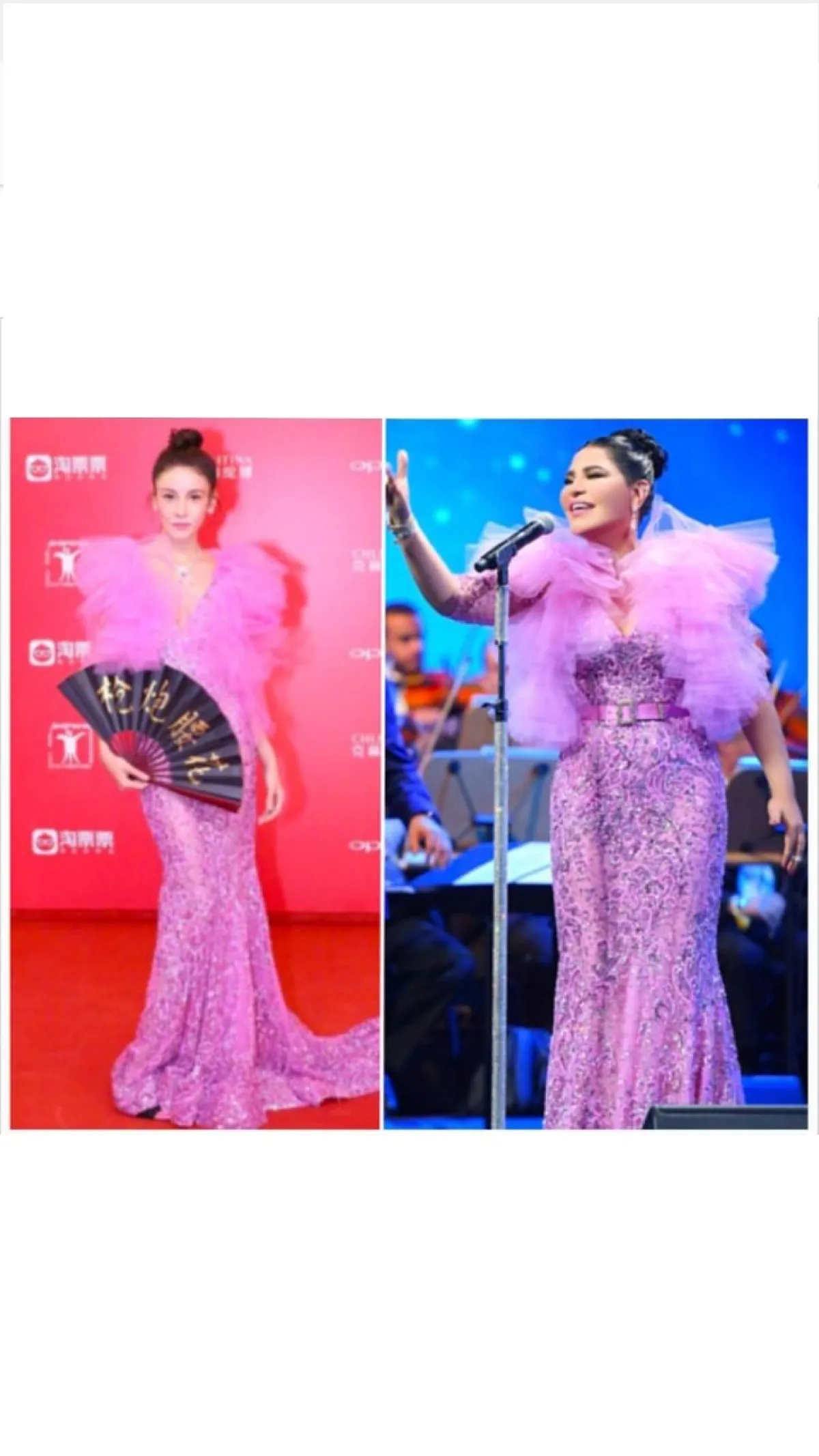 في مفارقة عادة ما تتكرر بين النجمات العرب والأجانب ، ارتدت النجمة الإماراتية أحلام فستاناً باللون الزهري سبق أن ارتدته النجمة اليابانية زهانغ ليكسينغ.