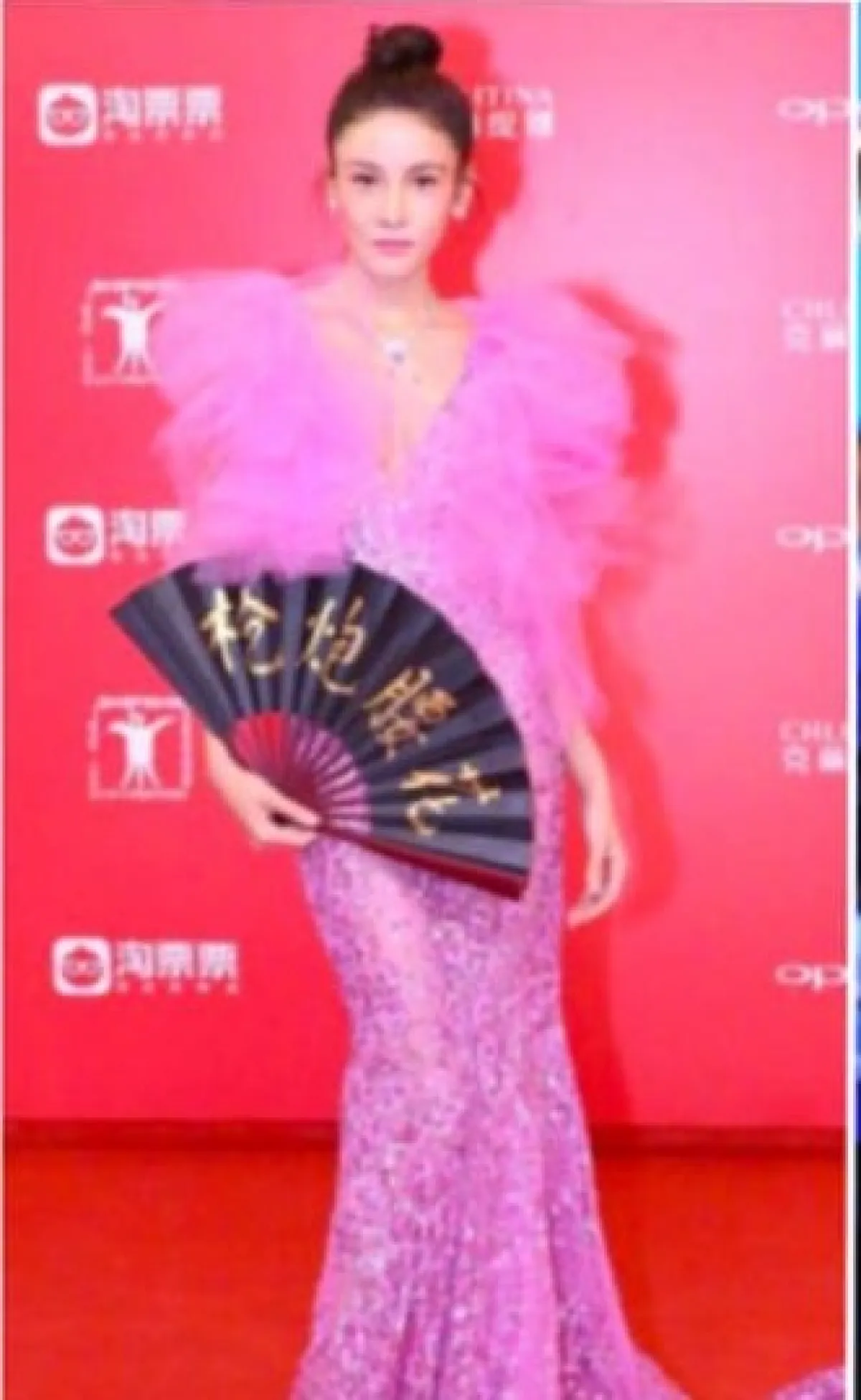 إلا أن النجمة اليابانية أضافت إلى إطلالتها إكسسواراً تقليدياً تمثّل بالمروحة اليدوية اليابانية .