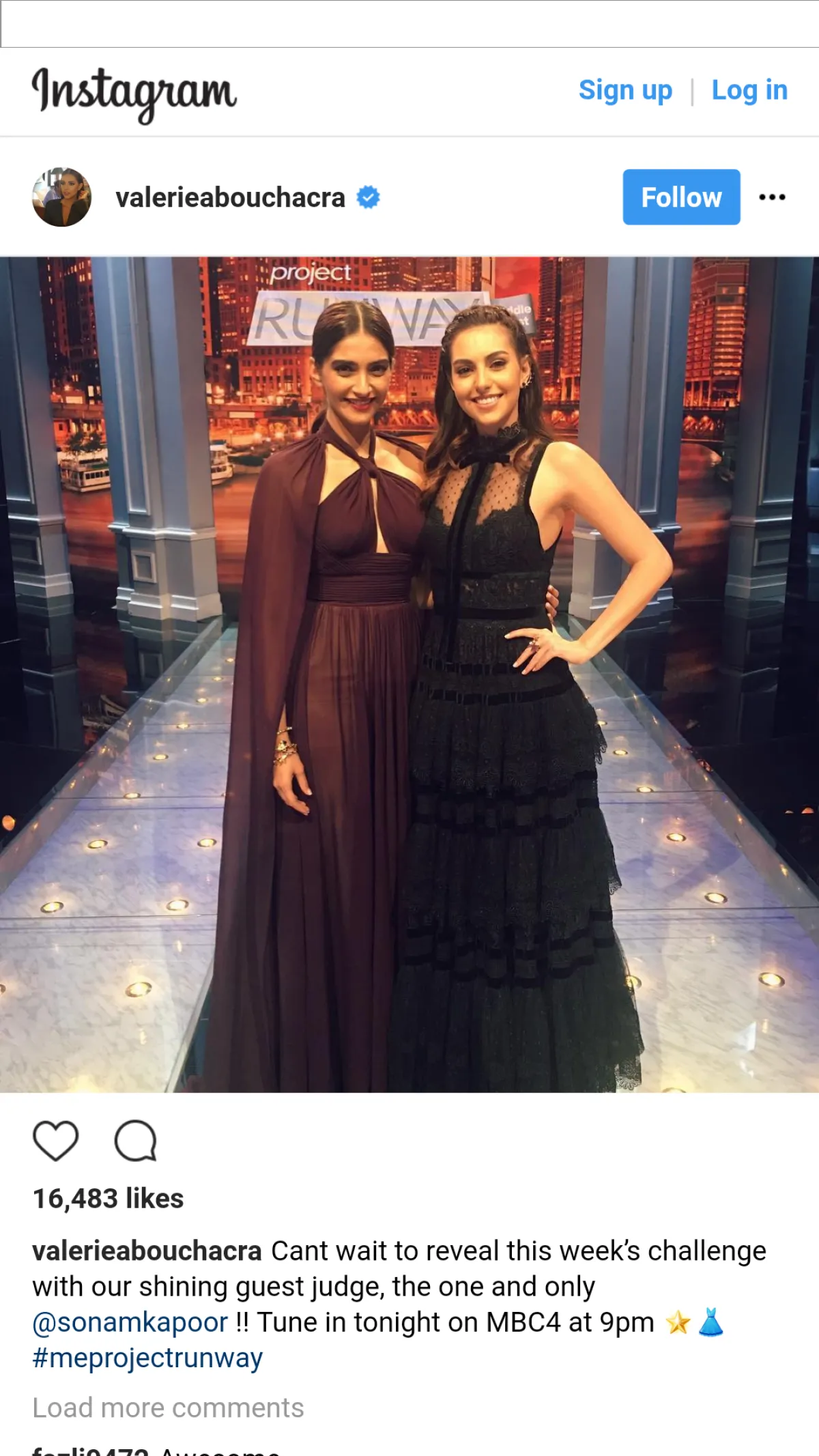 الصورة التي أعلنت فيها فاليري أنّ النجمة الهندية ستكون ضيفة هذا الأسبوع من البرنامج الشهير Project Runway الشرق الأوسط ظهرت فيها بفستان أسود طويل من الدانتيل ومزيّن باشرطة سوداء من المخمل من تصميم المصمم اللبناني العالمي إيلي صعب الذي يشارك كحكمٍ في البرنامج .