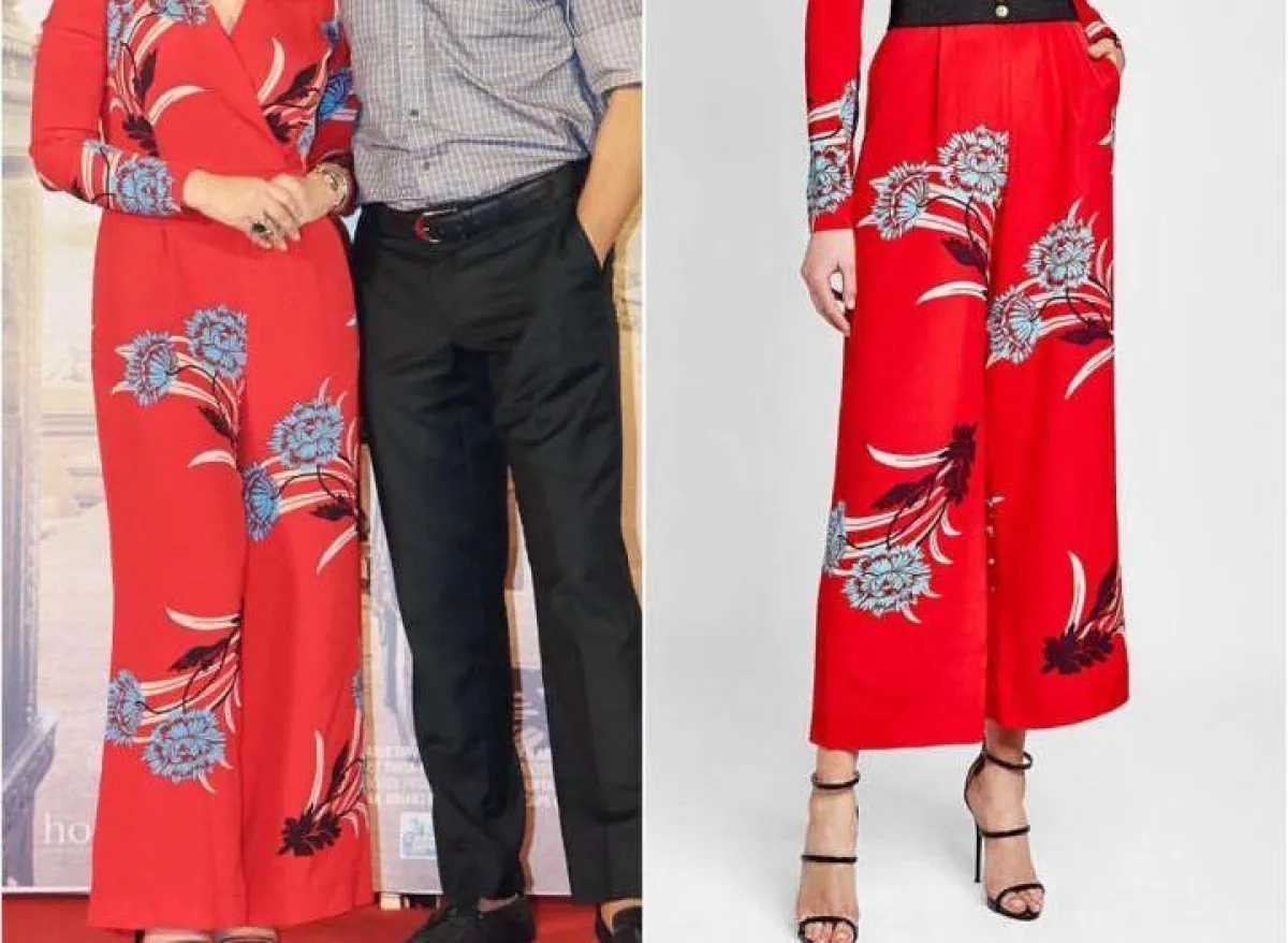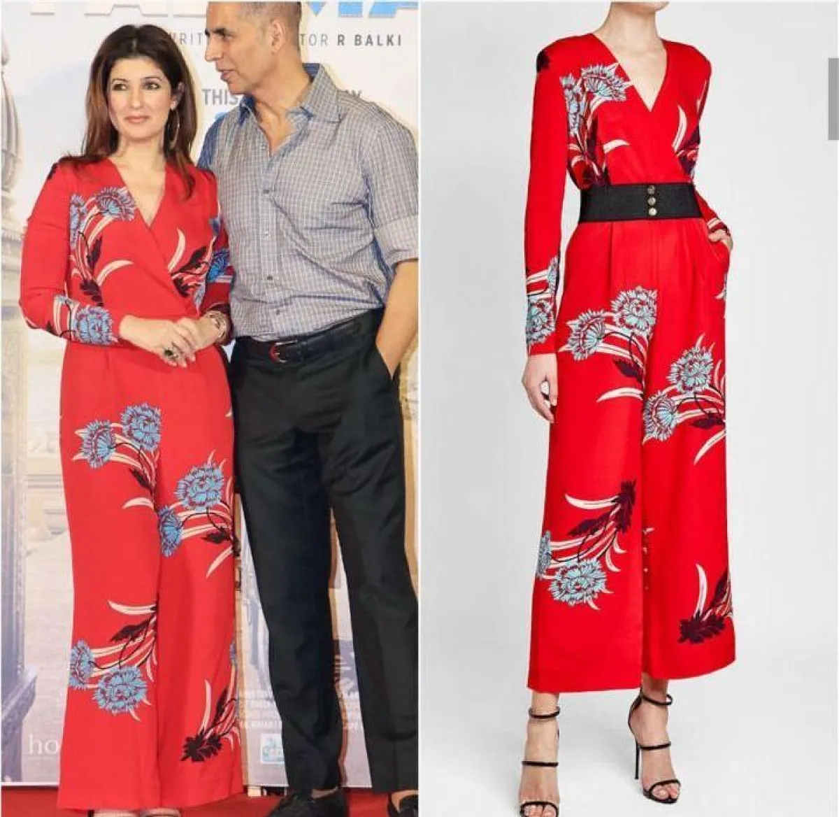 وظهرت خانا بجمبسوت أحمر مطبع بأزهار زرقاء كبيرة من الماركة العالمية المعروفة dvf.