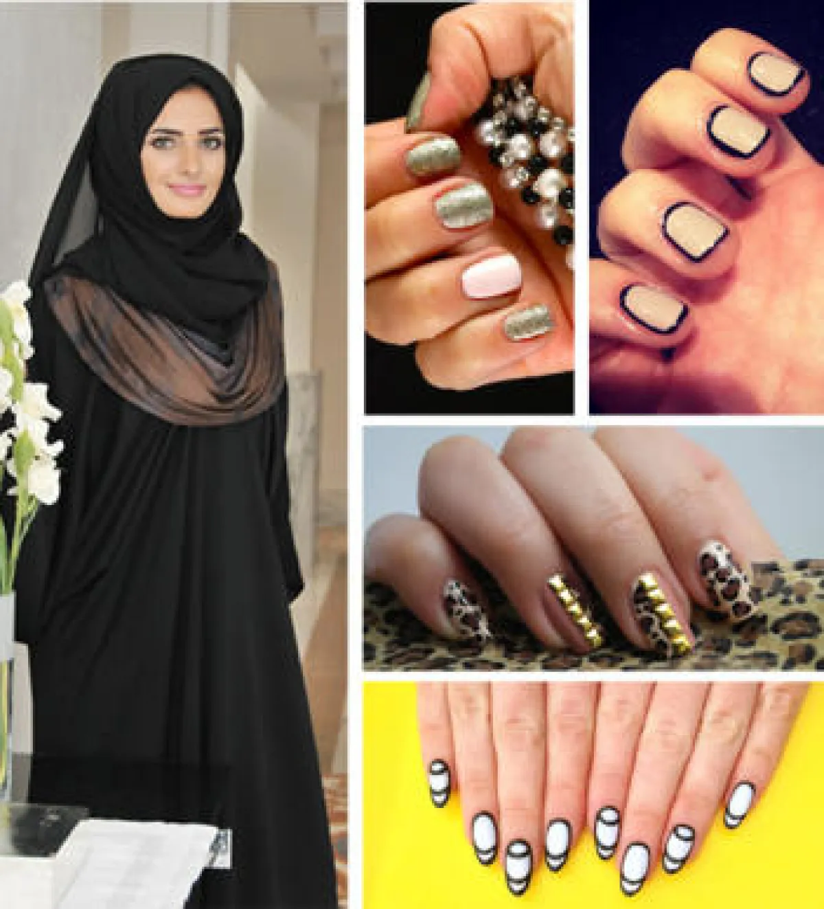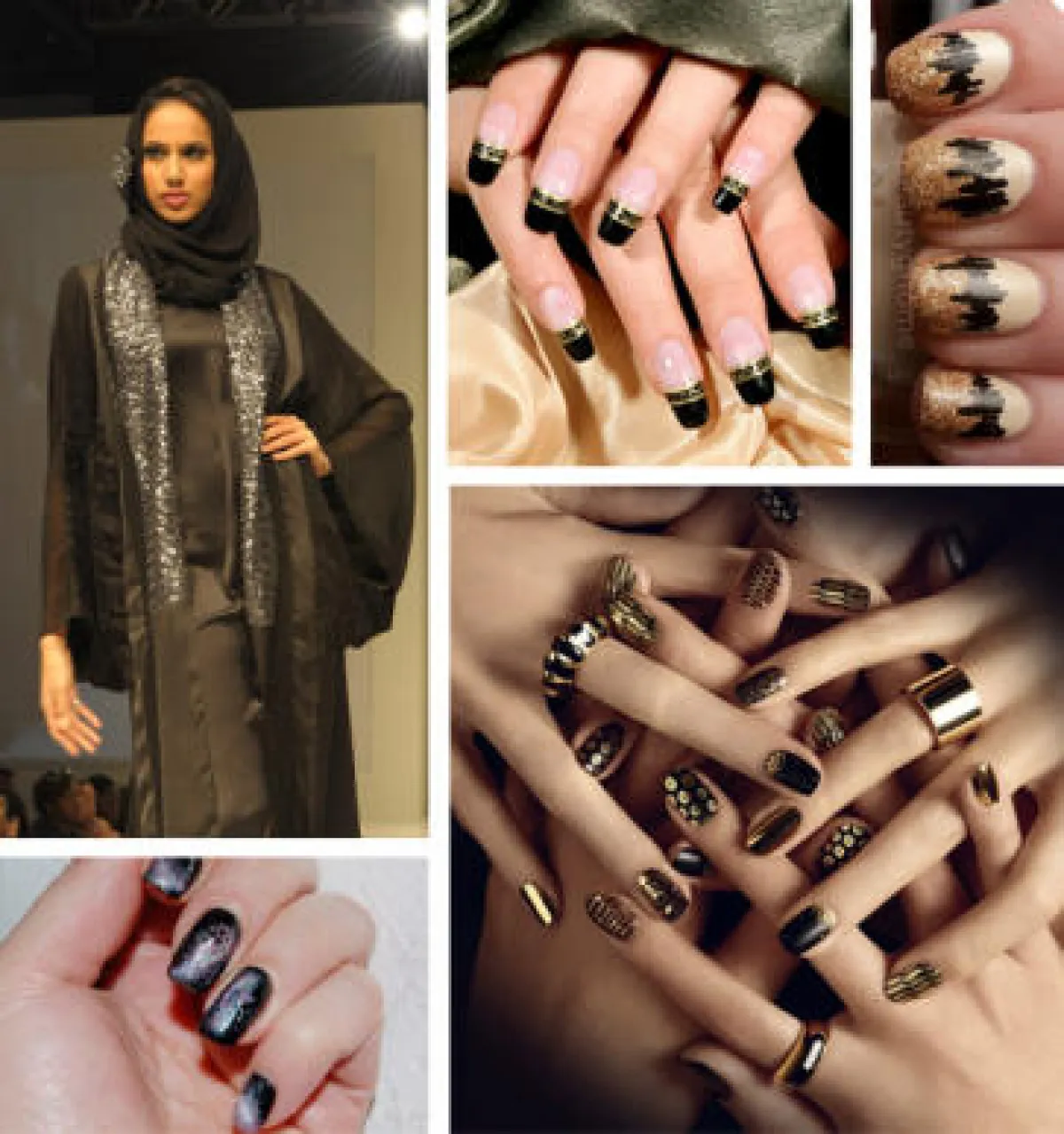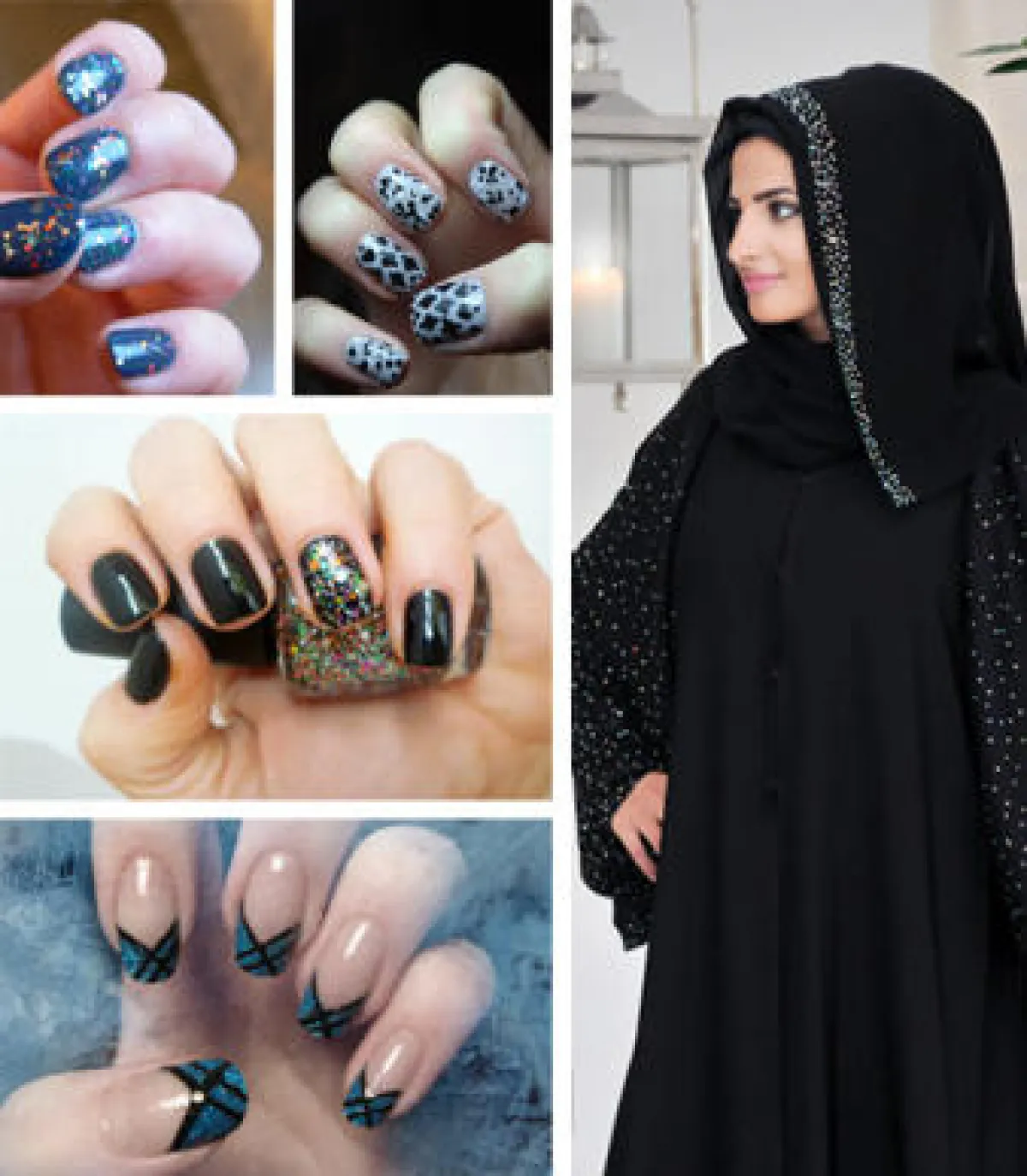 3. العباءة الملوّنة بالستراس والألوان لسهرة عشاء أو حفلة صغيرة: يُناسب هذه العباءة الأظافر اللافتة، كوضع لون موحّد وفوقه قطع لامعة أو تزيين الاصبع ما قبل الأخير بالألوان البرّاقة.