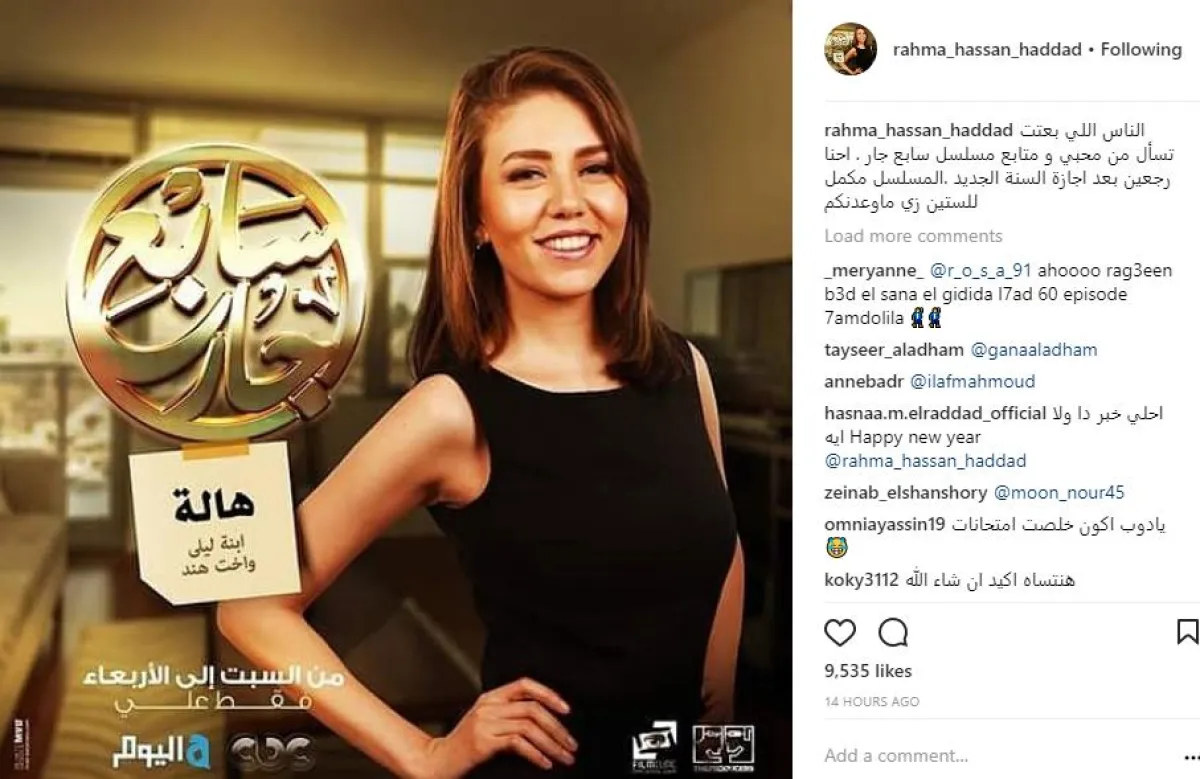 رحمة كتبت عبر صفحتها الشخصية على موقع انستقرام: الناس اللي باعتة بتسأل من متابعي ومحبي مسلسل سابع جار.. إحنا راجعين بعد إجازة السنة الجديدة.. المسلسل مكمّل للستين زي ما وعدناكم".