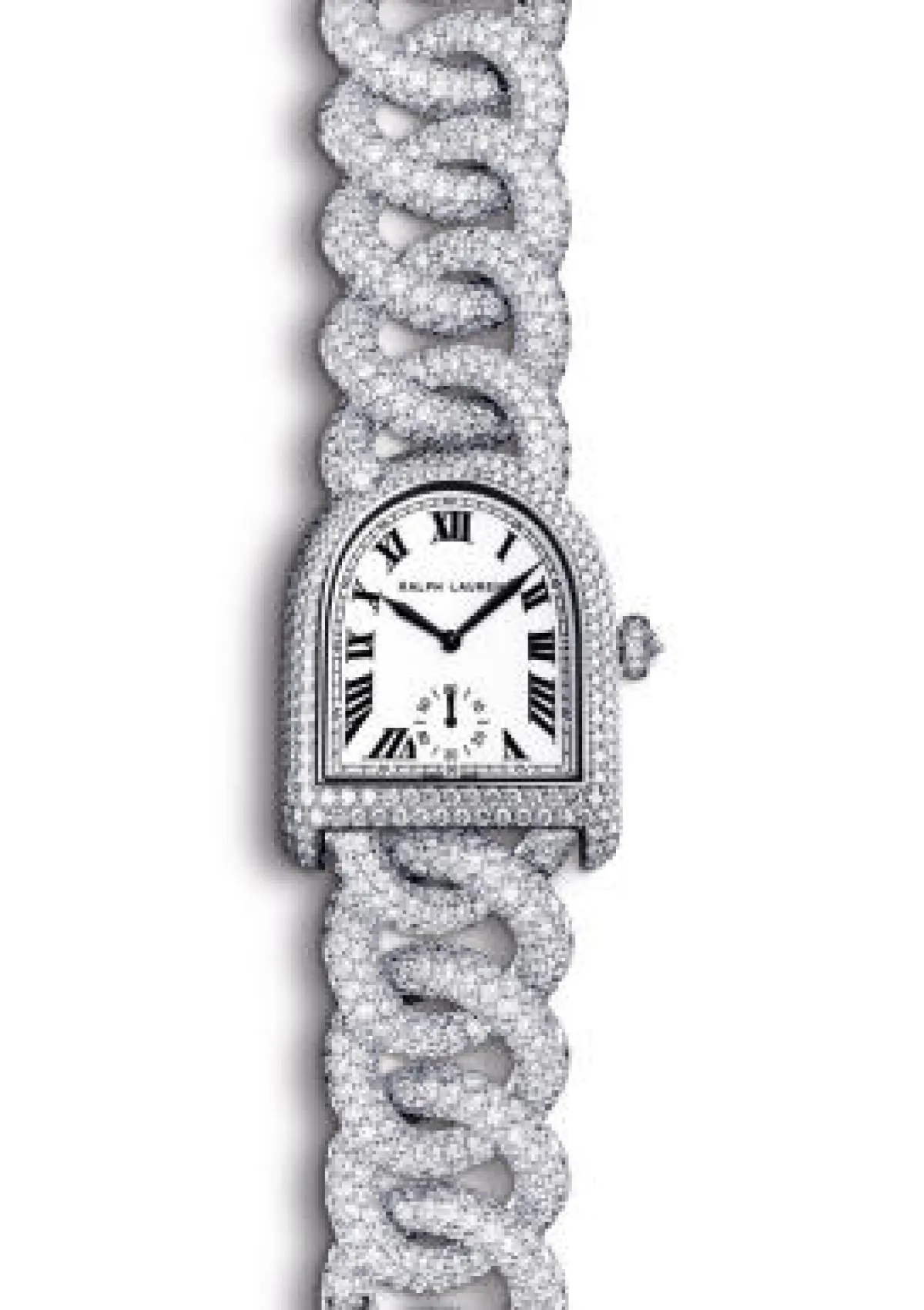 3 - ساعة " رالف لورين ستيروب كولكشن" Ralph Lauren Stirrup Collection، تحتوي على زخرفة آوت دي جنيف عمودية ونقش دائري، مصنوعة من الذهب الأبيض 18 قيراط، ومرصوفة بالماس بالكامل.