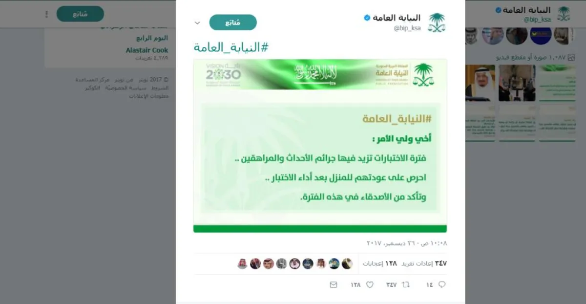 وجاء في نص التغريدة: "أخي ولي الأمر: فترة الاختبارات تزيد فيها جرائم الأحداث والمراهقين، احرص على عودتهم للمنزل بعد أداء الاختبار، وتأكد من الأصدقاء في هذه الفترة".