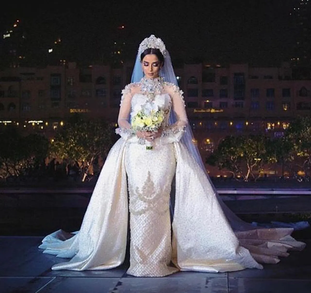 - أطلت العروس بفستان زفاف من تصميم السعودية "تيما عابد"، تميز بأكمامه الطويلة المزينة بالأحجار اللامعة، واستغرقت خياطته أكثر من 1400 ساعة، ورُصّع بأكثر من 20 ألف حجر ماسي.