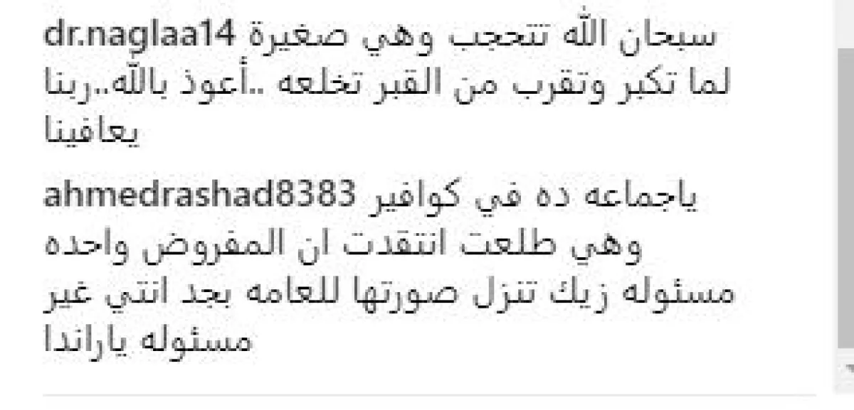 وعلقت أخرى: قلعت الحجاب على كبر ..يلا أحسن، أصلًا كانت بتبقى لابساه ونص شعرها باين ! فايدته إيه بقى !! ربنا يصلح الأحوال جميعًا".