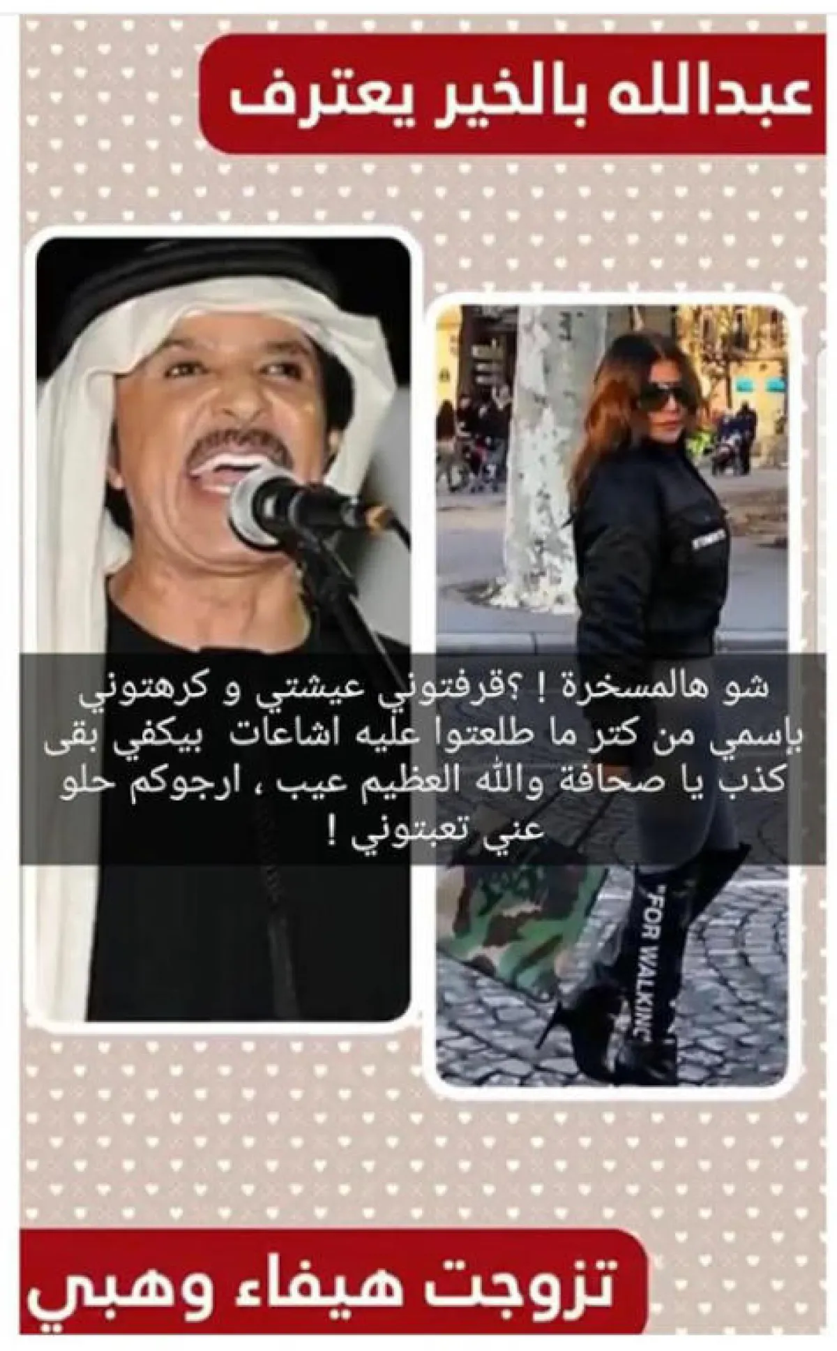 بعد تداول فيديو يتحدث فيه الفنان الإماراتي عبد الله بالخير ممازحاً عن زواجه من هيفاء وهبي، ومع أنه أوضح موقفه من هذا الموضوع بشكل واضح وأشار إلى أنه لم يتزوجها، ولكن هناك من تداول مقطعاً من كلامه للإيحاء بأنّه تزوجها.
