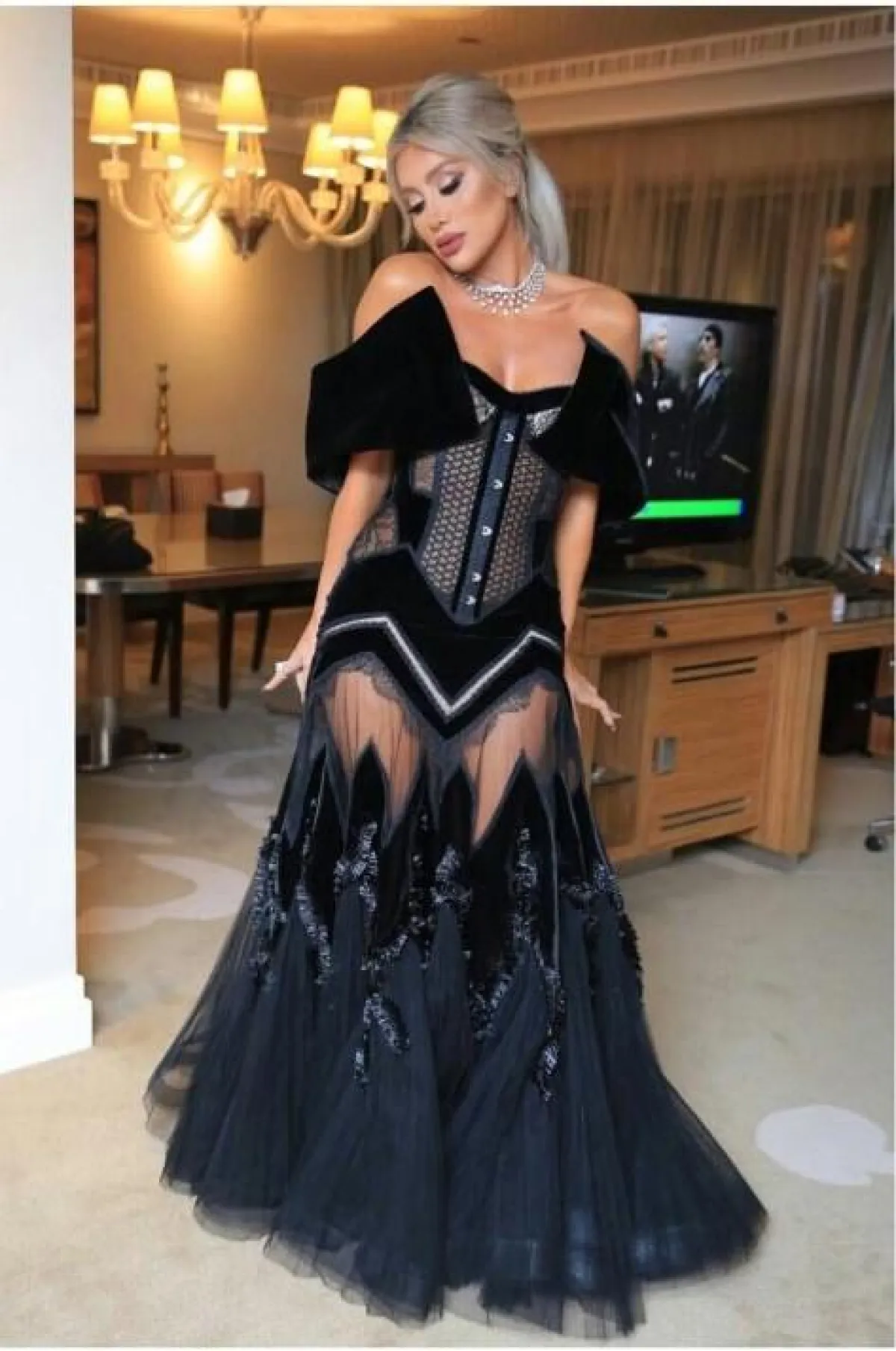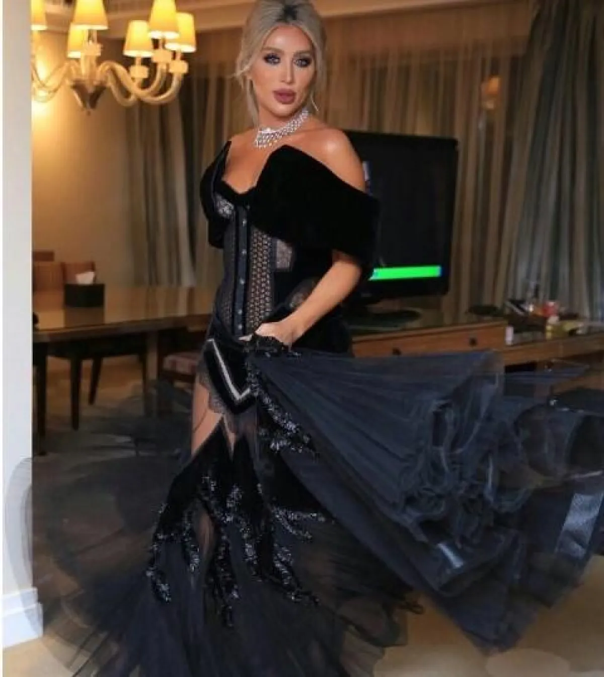 اطلالة مايا لم تكن عادية، بل ميّزتها أقمشة المخمل الأسود، إلى جانب الشفّاف والدانتيل عند الخصر والكشكاش من الأسفل.