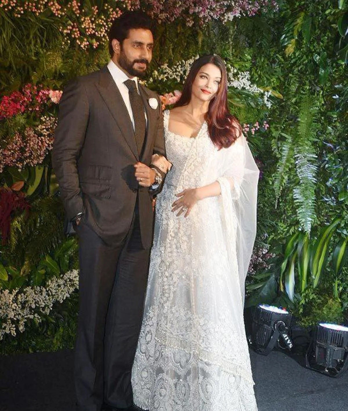 اطلالة أيشواريا خطفت الأنفاس بلونها الأبيض، حيث وصلت إلى حفل الاستقبال برفقة زوجها أبيهشيك باتشان Abhishek Bachachan، متألقة بالساري الهندي الطويل الذي تميز بالأكمام الشفافة الفضفاضة.