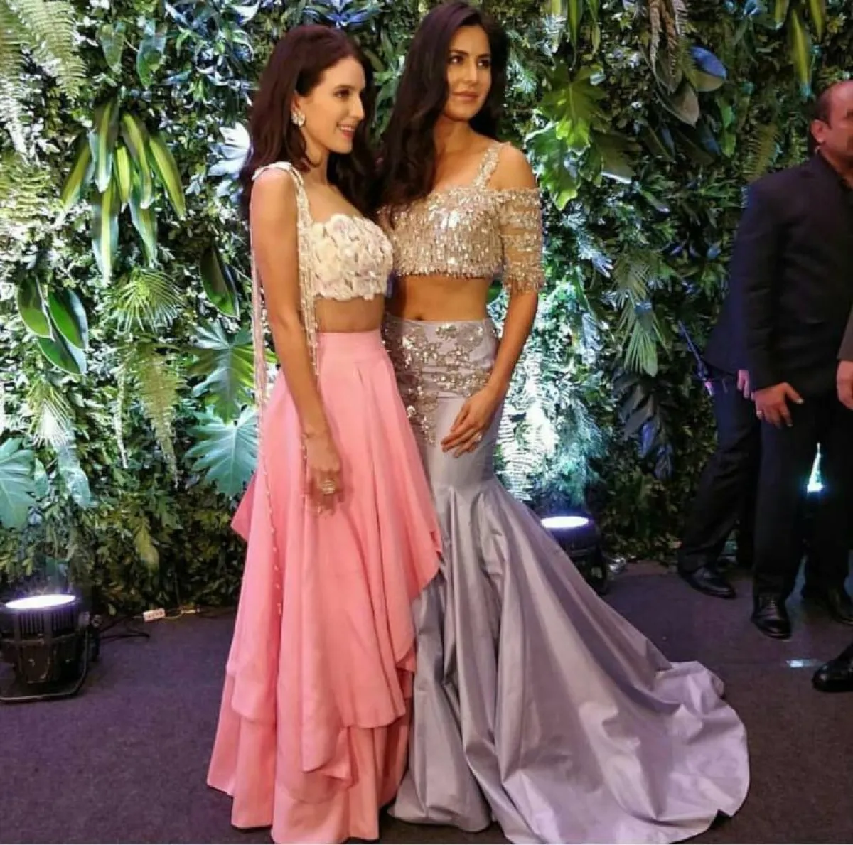 أما كاترينا فكانت أكثر جرأة من راي، بسبب الساري الهندي الأزرق اللون الذي اختارته من قطعتين Crop Top أو توب قصيرة، كشفت خصرها وبطنها بالكامل، والتنورة المصممة على شكل حورية البحر، المطرزة بالستراس الفضي والأزرق الفاتح.