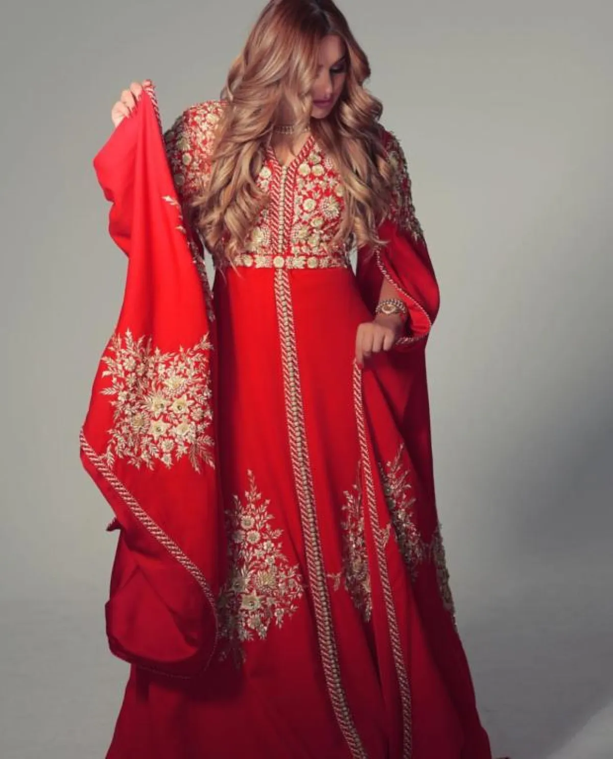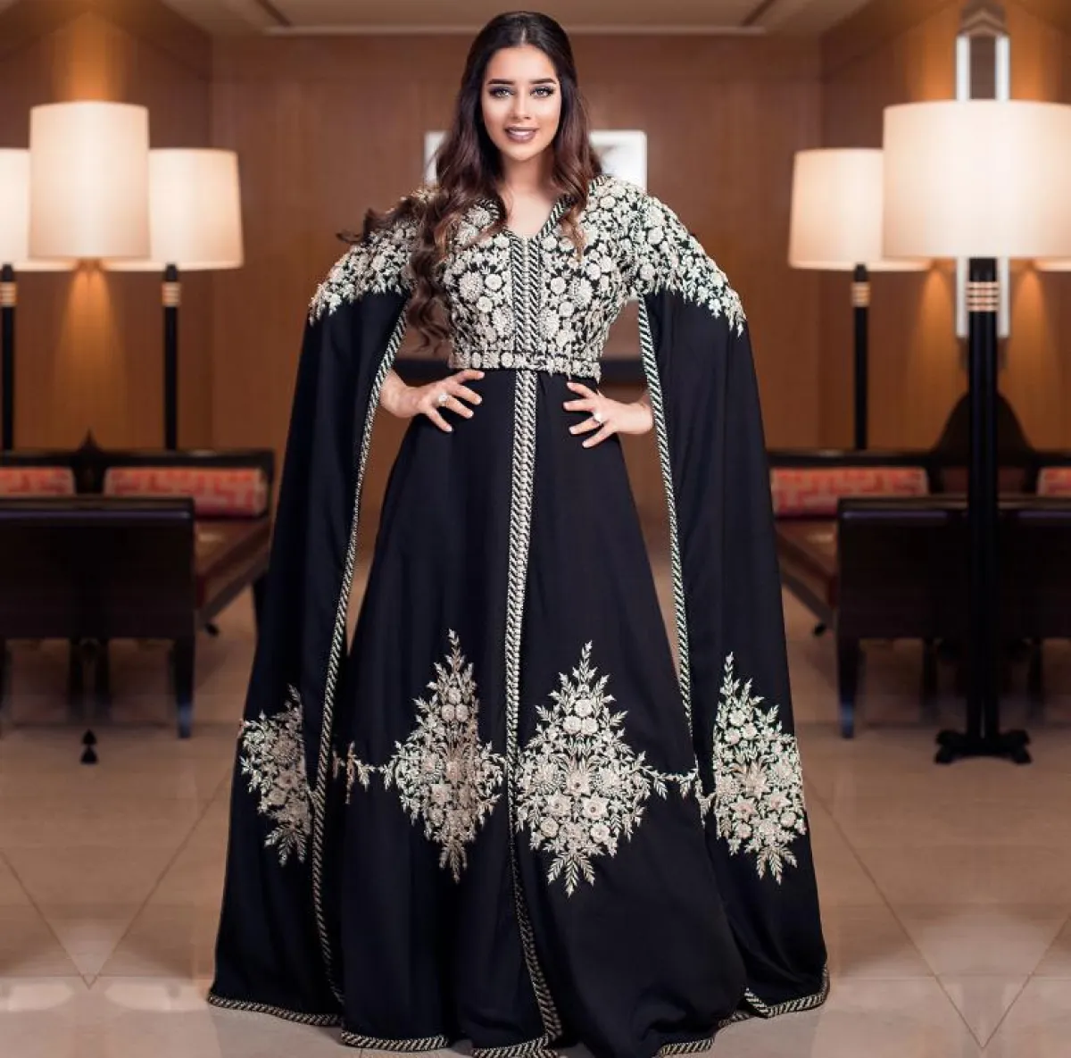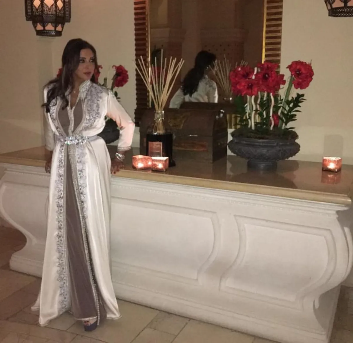البداية مع الفنانة اليمنية بلقيس فتحي التي ظهرت في أحدث إطلالاتها بالقفطان، بتصميم باللون الأسود مطرّز بخيوط باللون البيج الذهبي، حمل توقيع علامة Lalla Eman وقد طغت على الإطلالة لمسات كلاسيكية ساحرة.