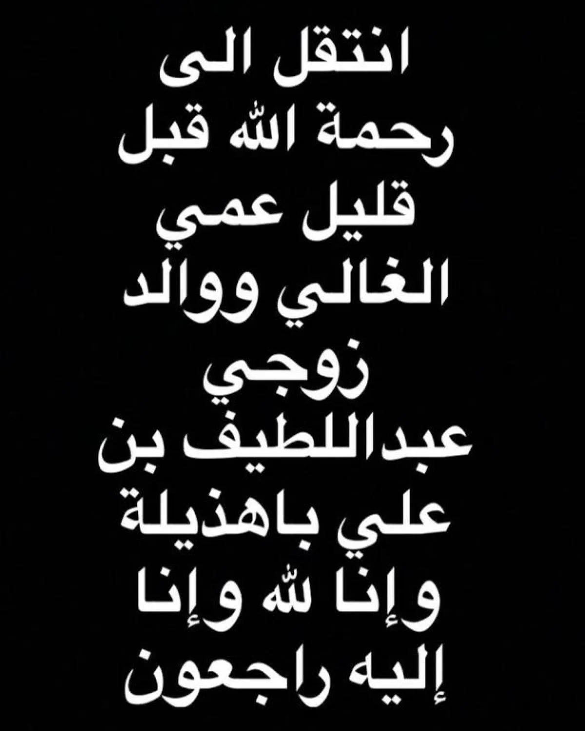 بلقيس التي نشرت النعي على خلفية سوداء للتأكيد على الحداد، كتبت: "إنتقل إلى رحمة الله قبل قليل عمي الغالي ووالد زوجي عبد اللطيف بن علي باهذيلة وإنا لله وإنا إليه راجعون".