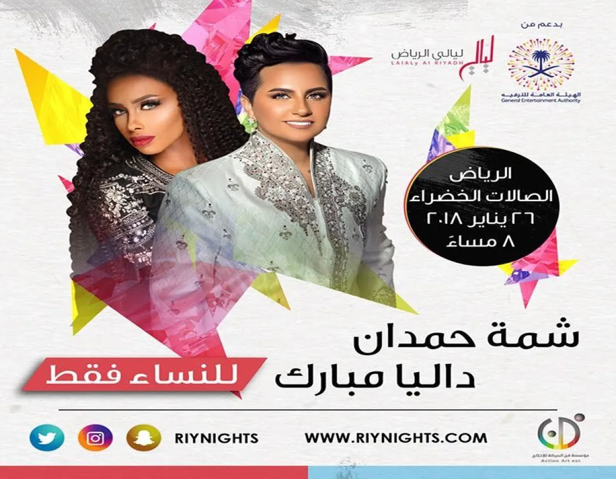 وفي وقت سابق تم الإعلان عن حفل " نسائي " يجمع كل من الفنانتين شمة حمدان وداليا مبارك والمزمع إقامته في الصالات الخضراء في العاصمة الرياض في السادس والعشرين من يناير الحالي ، إلا أنه تم تأجيل الحفل لوقت لاحق يحدد فيما بعد .