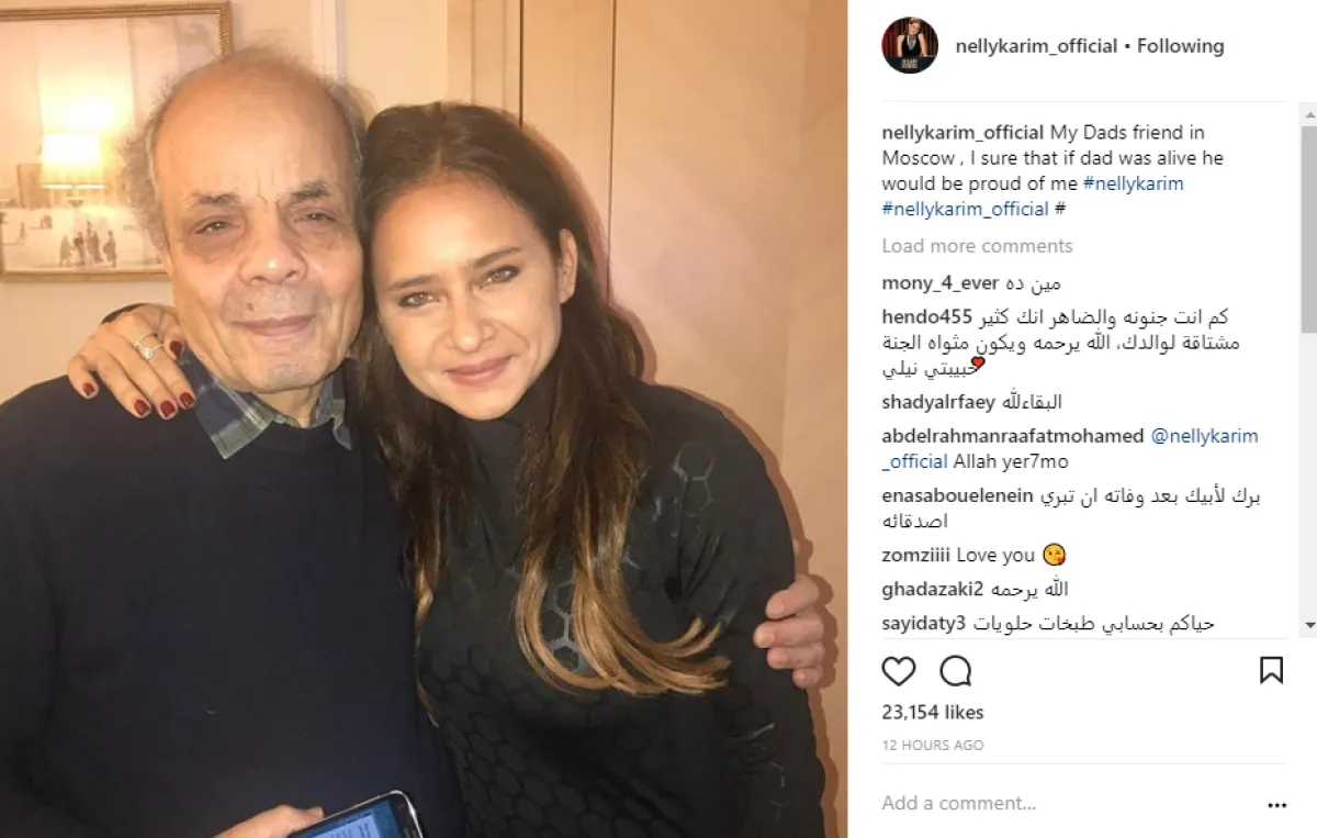 نيللي ظهرت في الصورة مع صديق والدها، وعلقت قائلة: صديق والدي في موسكو متأكدة إن لو والدي كان عايش كان هيبقى فخور بيه.