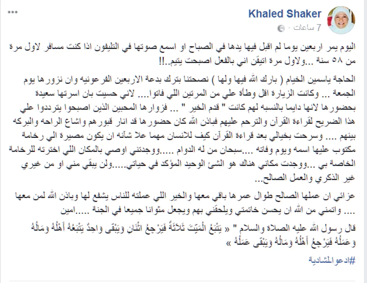 واستشهد خالد شاكر بالحديث الشريف: قال رسول الله عليه الصلاة والسلام " « يَتْبَعُ الْمَيِّتَ ثَلاَثَةٌ فَيَرْجِعُ اثْنَانِ وَيَبْقَى وَاحِدٌ يَتْبَعُهُ أَهْلُهُ وَمَالُهُ وَعَمَلُهُ فَيَرْجِعُ أَهْلُهُ وَمَالُهُ وَيَبْقَى عَمَلُهُ »، ودشن بعدها هاشتاق بعنوان "أدعوا لشادية".