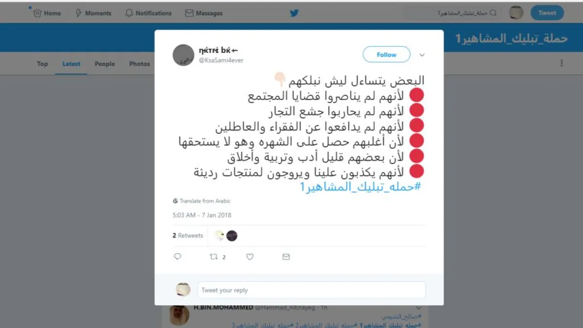ويبدو أن هؤلاء الأشخاص وجدو حلاً للمشاهير المضللين وغير المفيدين، حيث أطلقوا هاشتاقاً، باسم "#حملة_تبليك_المشاهير"، وصل إلى "الترند". ويقوم المغردون يومياً بالتركيز على حساب معيَّن لم يفد متابعيه والتبليغ عنه حتى يغلق.