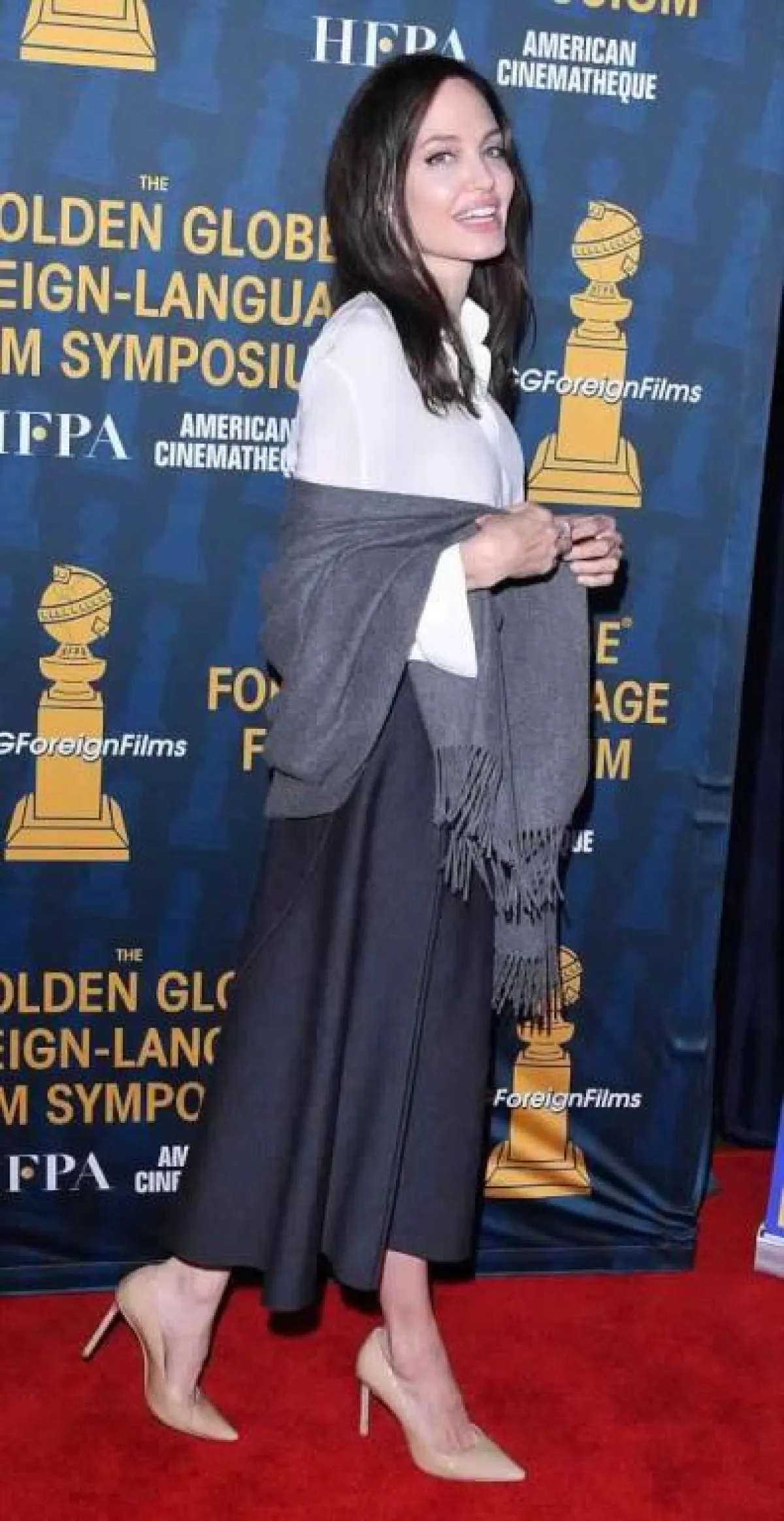 وظهرت أنجلينا (42 عاماً) على السجادة الحمراء بتنورة فضفاضة، والمعروفة باسم navy skirt، مع وشاح رمادي من نفس لون التنورة على أكتافها، وحذاء كلاسيكي بكعب عال وقميص أبيض واسع.