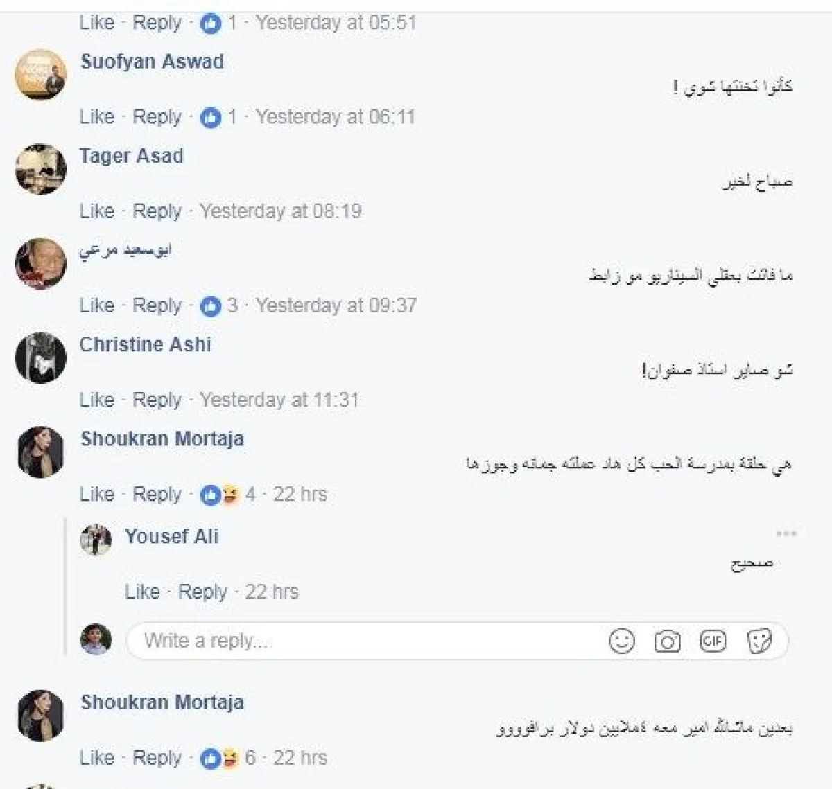وعلّقت شكران على الخبر الذي شاركه صفوان بلهجة ساخرة : هي حلقة بمدرسة الحب كل هاد عملته جمانه وجوزها ".