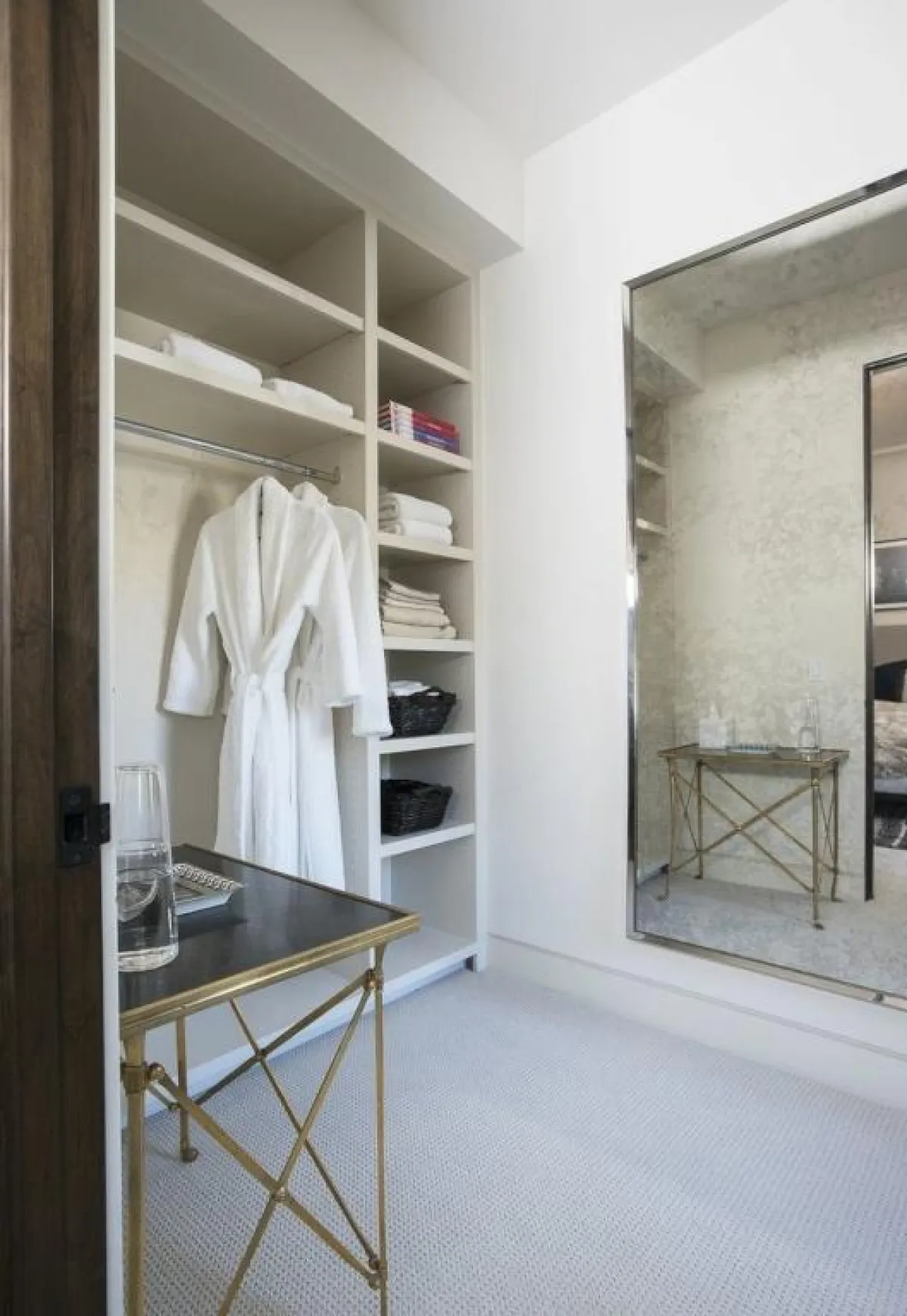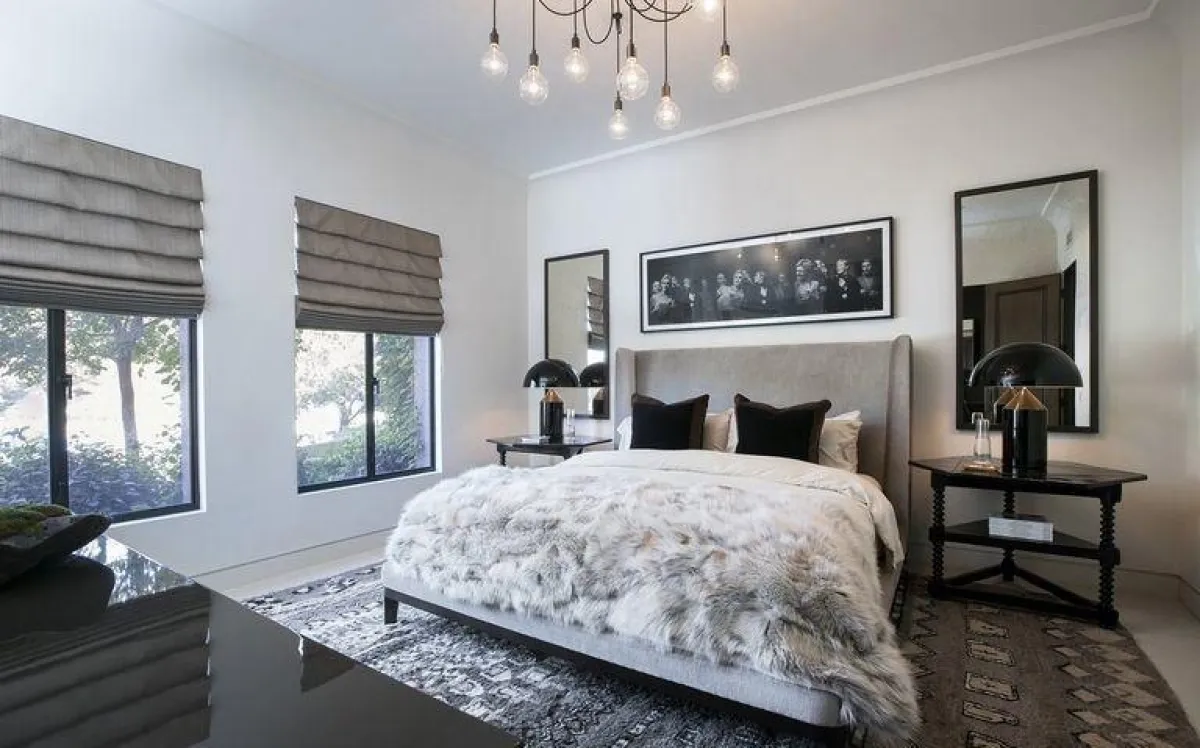فوق السرير تتدلَّى مجموعة من المصابيح المُتصلة ببعضها البعض بواسطة شرائط، ما يشبه خيوط العنكبوت ويُضفي الحيويَّة على المساحة الخالية من الألوان. وقد اكتفت النجمة بحضور اللونين الأسود والأبيض في تصميم الغرفة، وفق نمط الـ"مونوكروم" في الديكور، إرضاءً لأذواق النزلاء كافة. ولم تغفل كارداشيان عن وضع كتب أسفل الطاولتين الجانبيتين ليتمكَّن الضيوف من القراءة، قبل النوم.